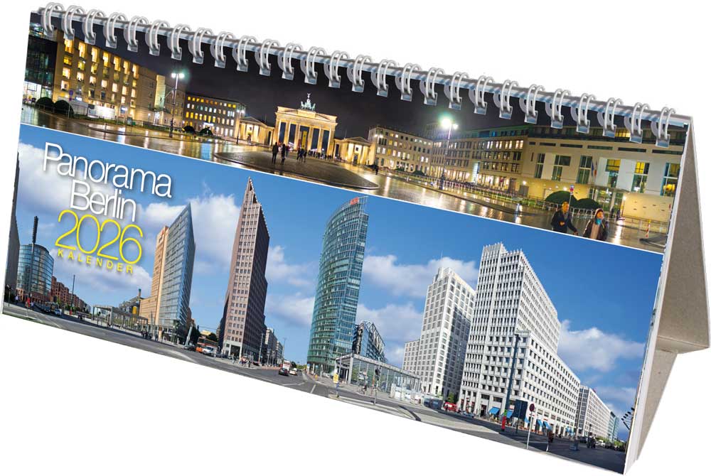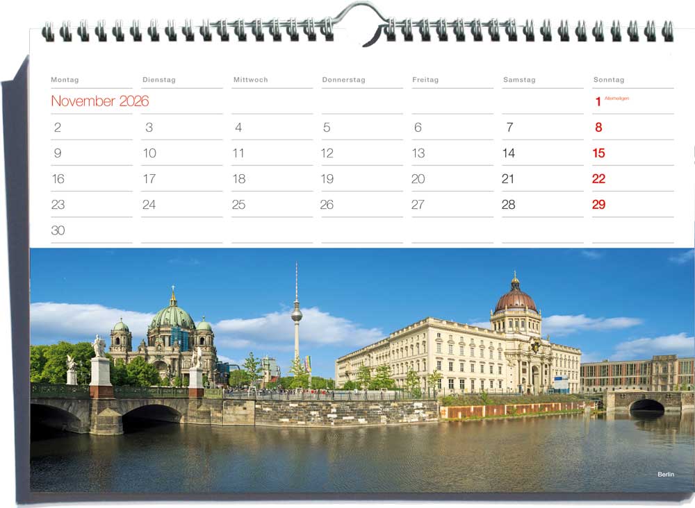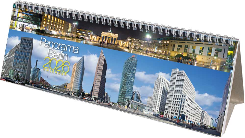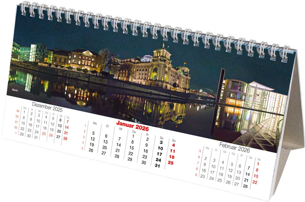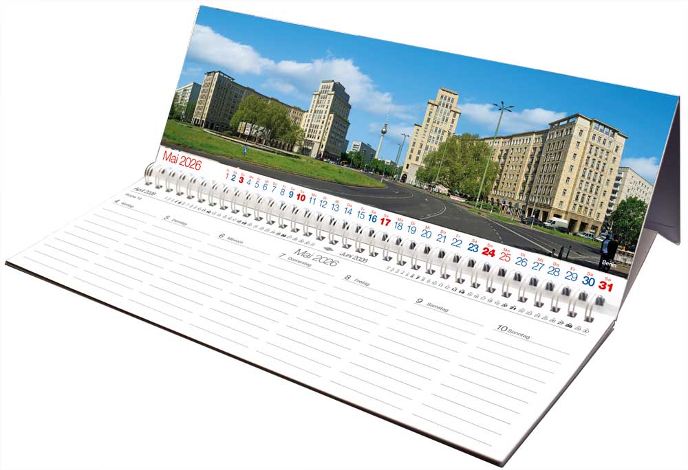 Mit 52 Seiten für Termineinträge. Der Planer liegt nicht nur flach auf dem Schreibtisch, um Termineinträge vorzunehmen: Der Planer ist ein Aufstellkalender mit dem aufgestellten Panoramafoto, das wöchentlich wechselt.