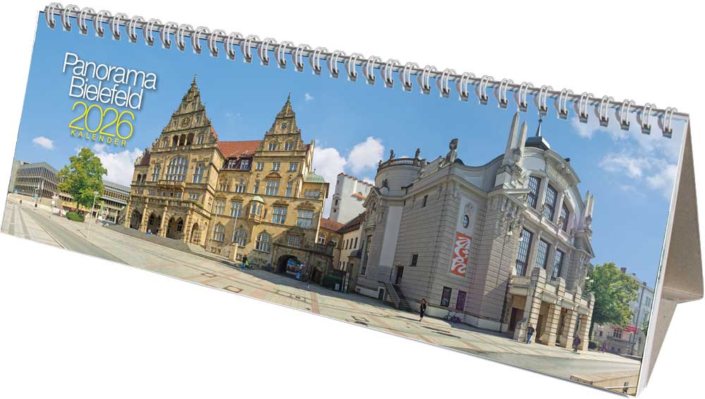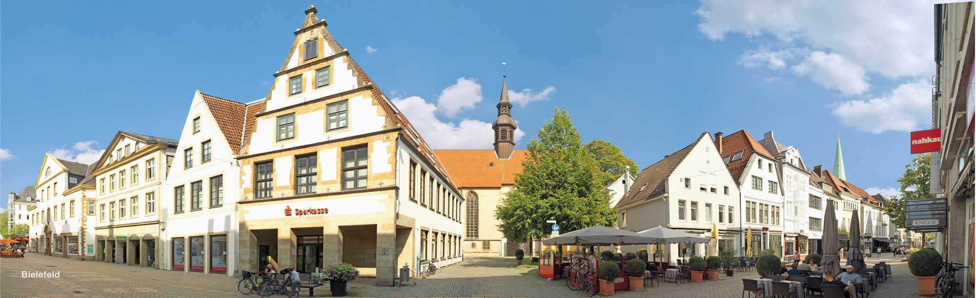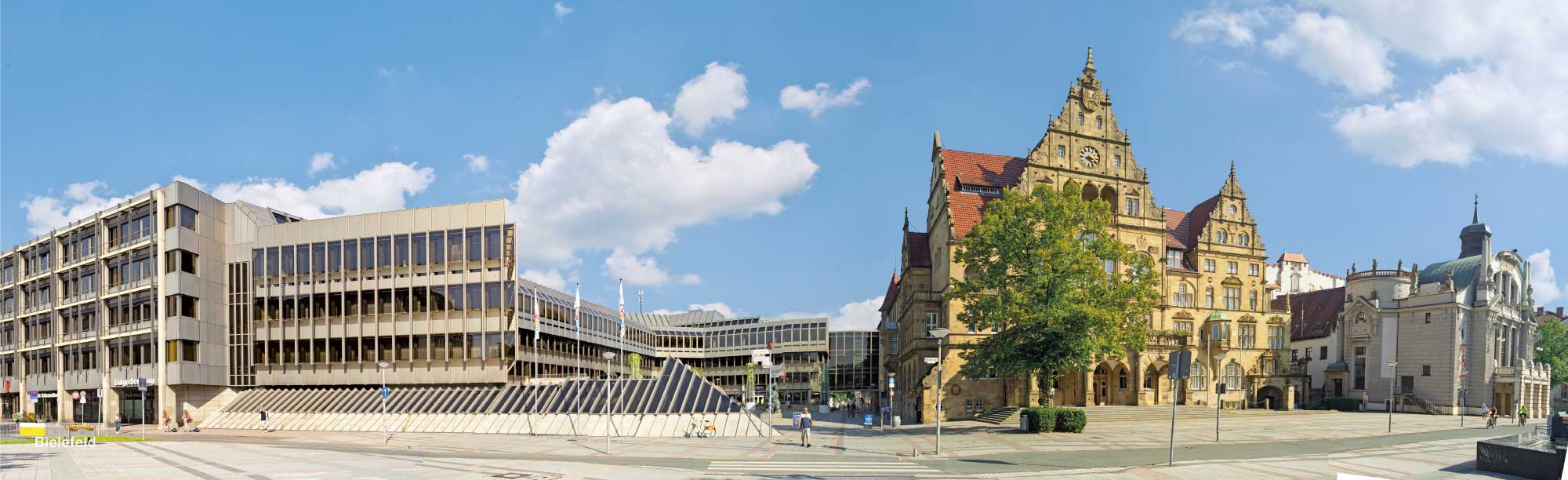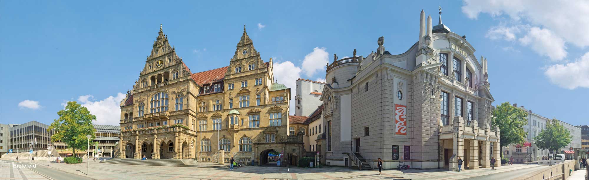 Das Alte Rathaus, das neue Rathaus und das Stadttheater in Bielefeld - das alles zusammen auf einem Panoramabild. Weitere Panoramen zeigen Motive aus Bielefeld, die einen Blickwinkel von mehr als 180 Grad umfassen.