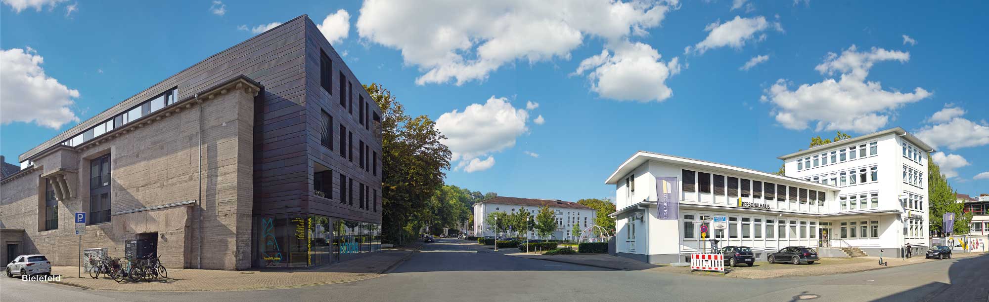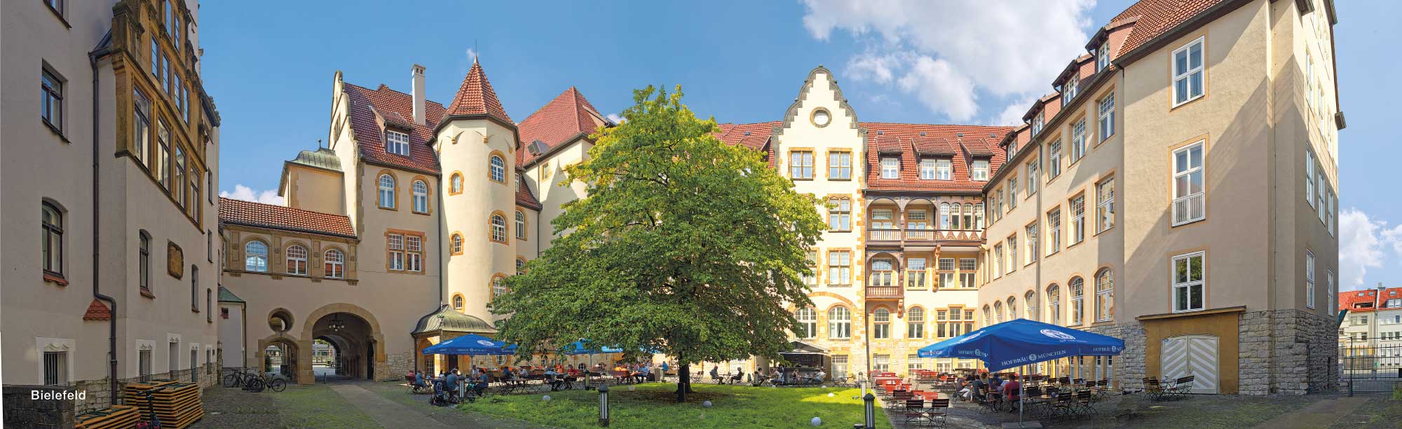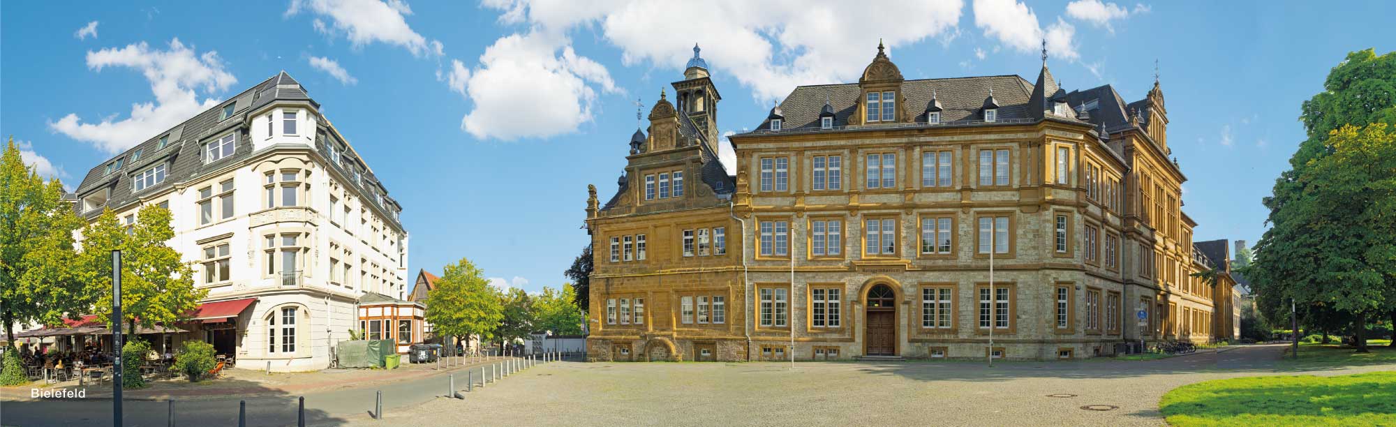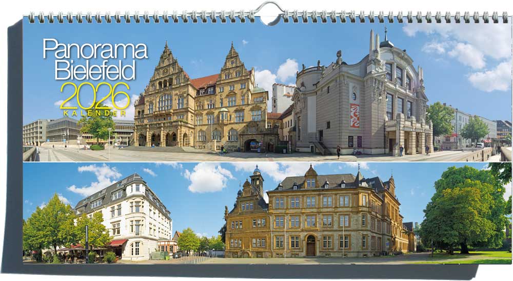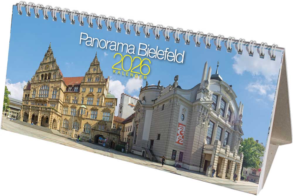 Das Alte Rathaus, das neue Rathaus und das Stadttheater in Bielefeld - das alles zusammen auf einem Panoramabild. Weitere Panoramen zeigen Motive aus Bielefeld, die einen Blickwinkel von mehr als 180 Grad umfassen.