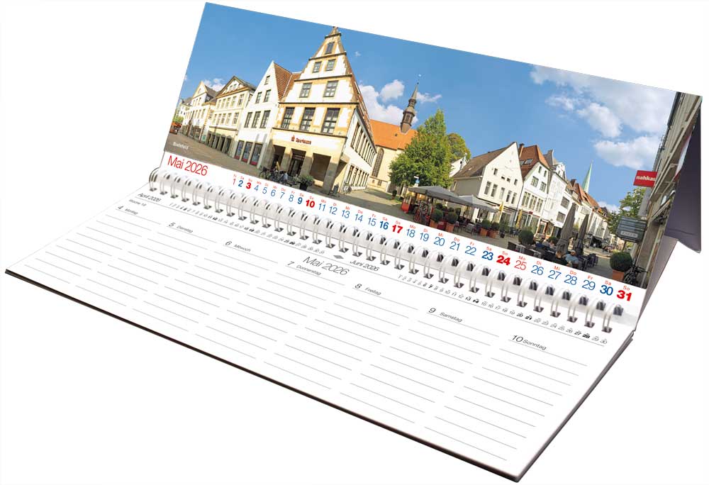 Mit 52 Seiten für Termineinträge. Der Planer liegt nicht nur flach auf dem Schreibtisch, um Termineinträge vorzunehmen: Der Planer ist ein Aufstellkalender mit dem aufgestellten Panoramafoto, das wöchentlich wechselt.