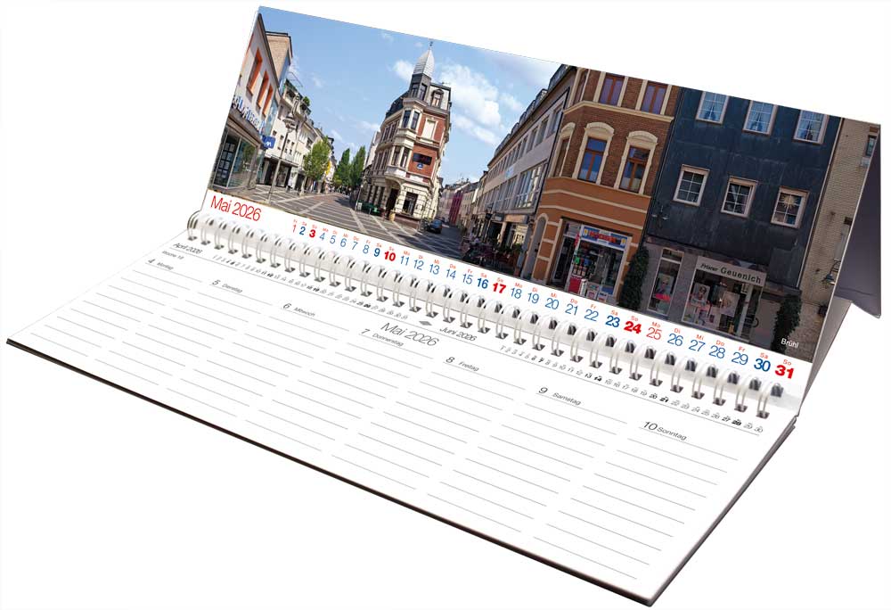 Mit 52 Seiten für Termineinträge. Der Planer liegt nicht nur flach auf dem Schreibtisch, um Termineinträge vorzunehmen: Der Planer ist ein Aufstellkalender mit dem aufgestellten Panoramafoto, das wöchentlich wechselt.