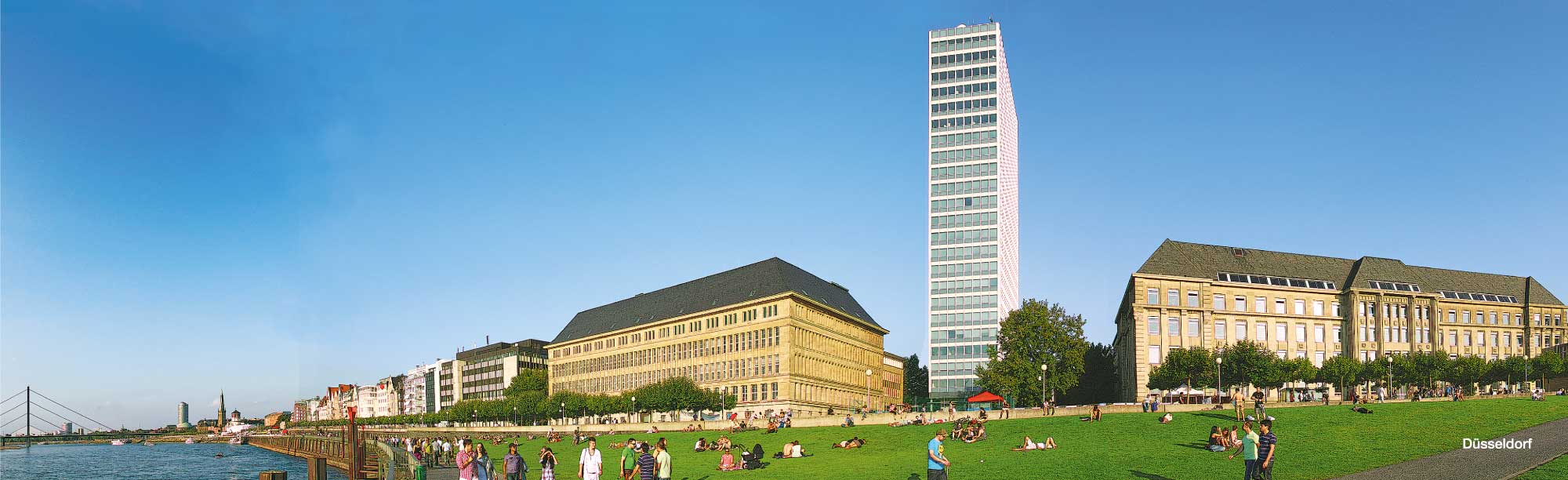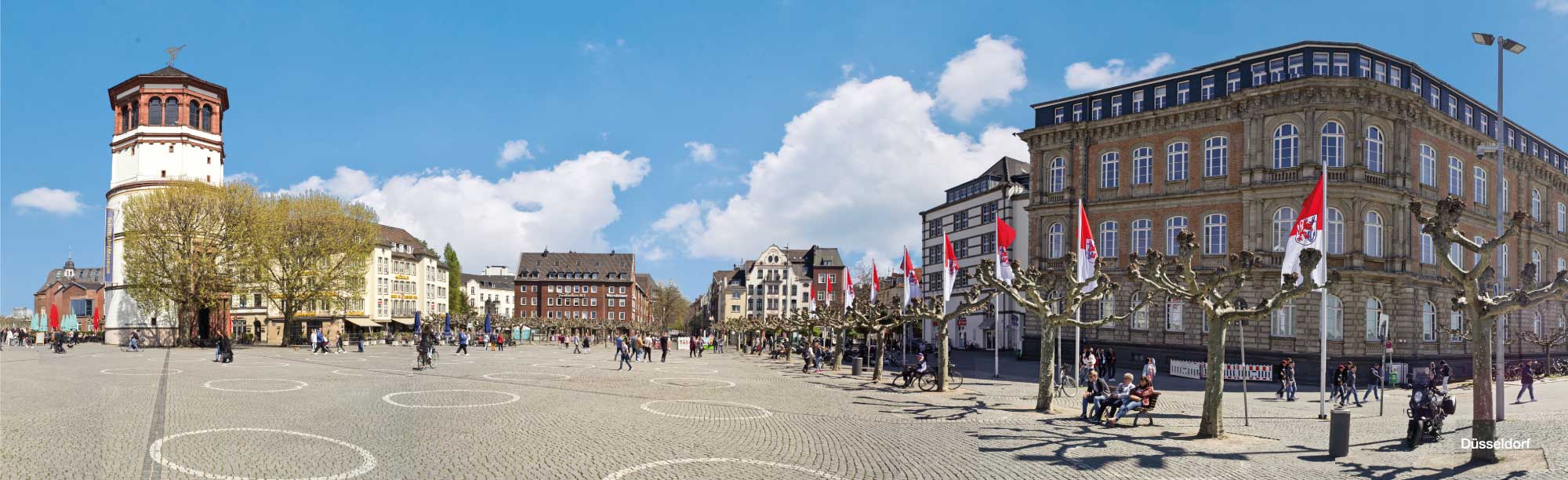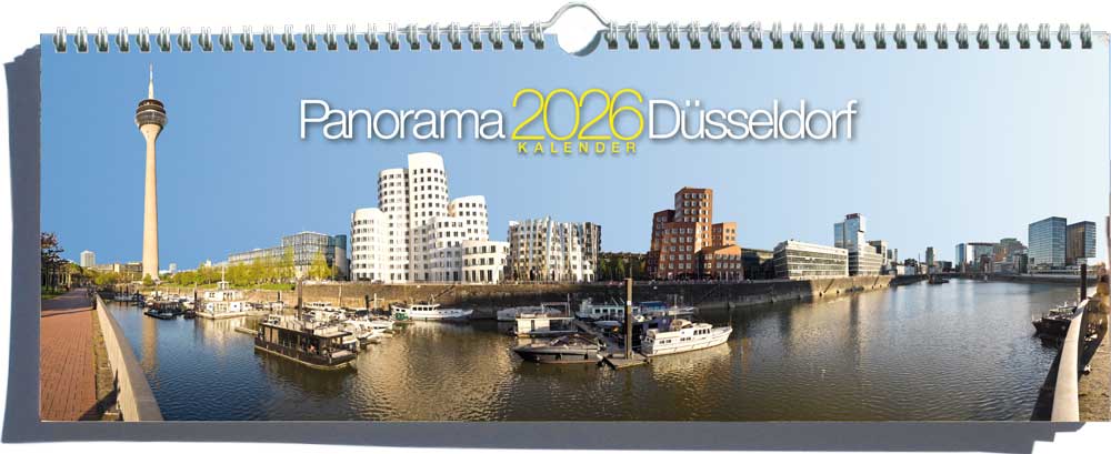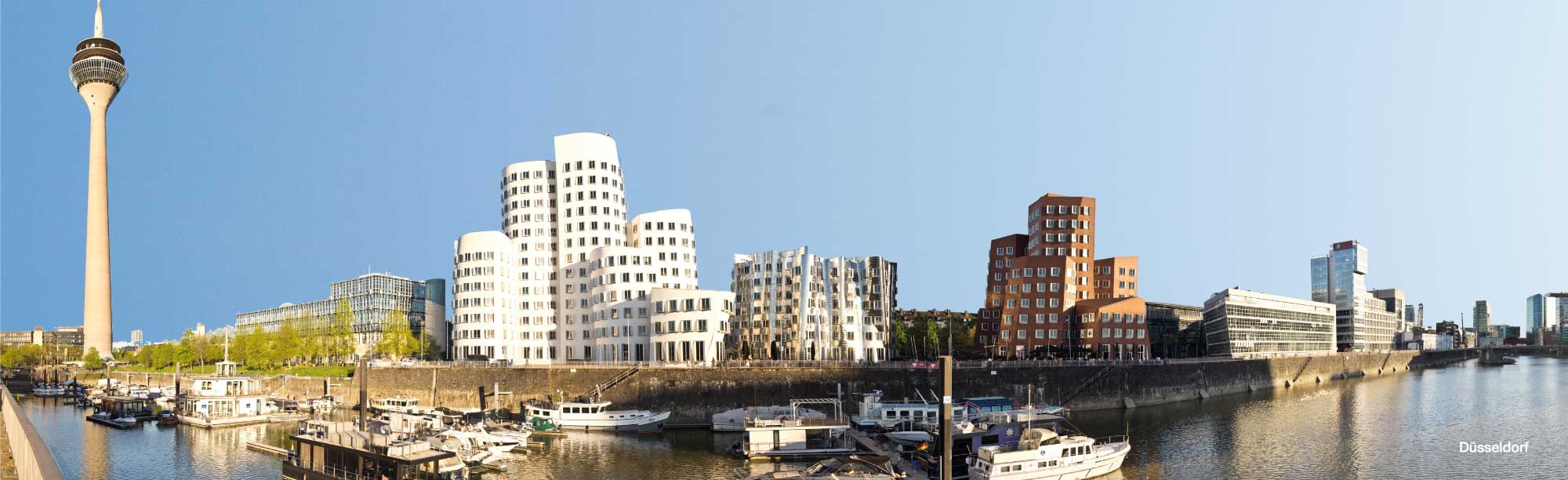 Der Medienhafen mit den umgebenden preisgekrönten modernen Gebäuden ist eines der Panoramen, mit einem Rundblick von mehr als 180 Grad. Weitere Düsseldorf Panoramen: die Altstadt, das Düsseldorfer Schauspielhaus, Rheinpromenade mit St. Lambertus, die Königsallee und viele mehr.