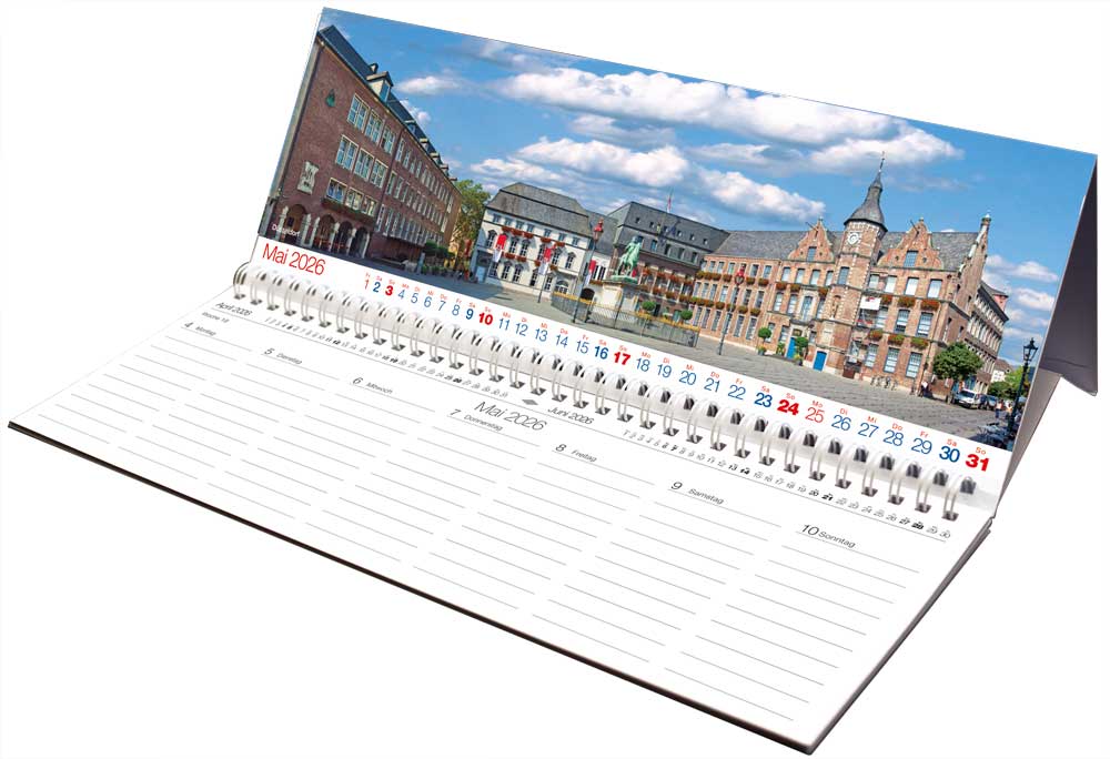 Mit 52 Seiten für Termineinträge. Der Planer liegt nicht nur flach auf dem Schreibtisch, um Termineinträge vorzunehmen: Der Planer ist ein Aufstellkalender mit dem aufgestellten Panoramafoto, das wöchentlich wechselt.