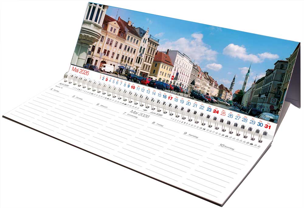 Mit 52 Seiten für Termineinträge. Der Planer liegt nicht nur flach auf dem Schreibtisch, um Termineinträge vorzunehmen: Der Planer ist ein Aufstellkalender mit dem aufgestellten Panoramafoto, das wöchentlich wechselt.