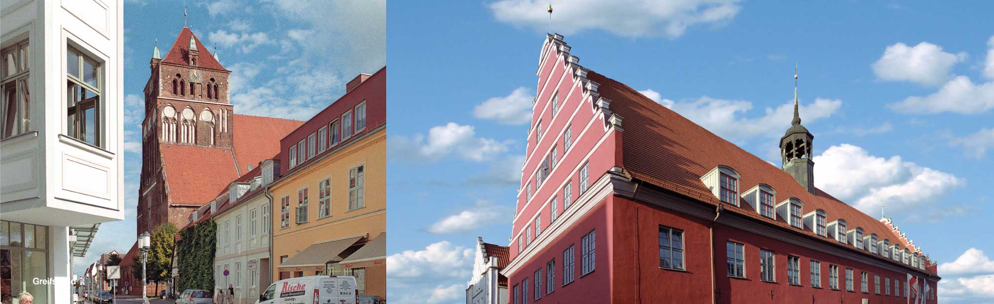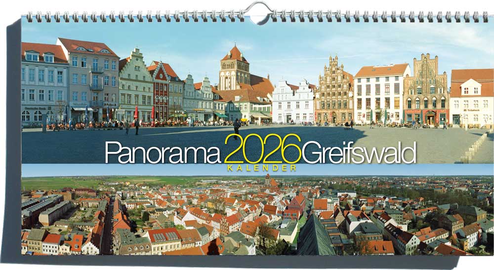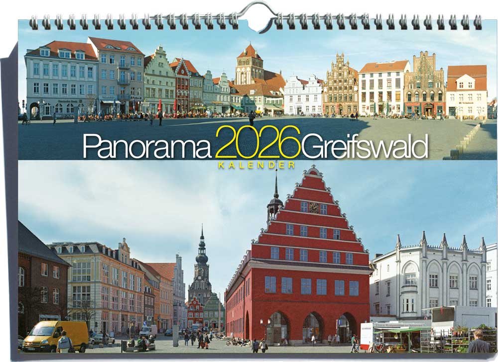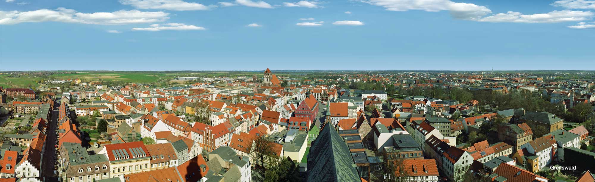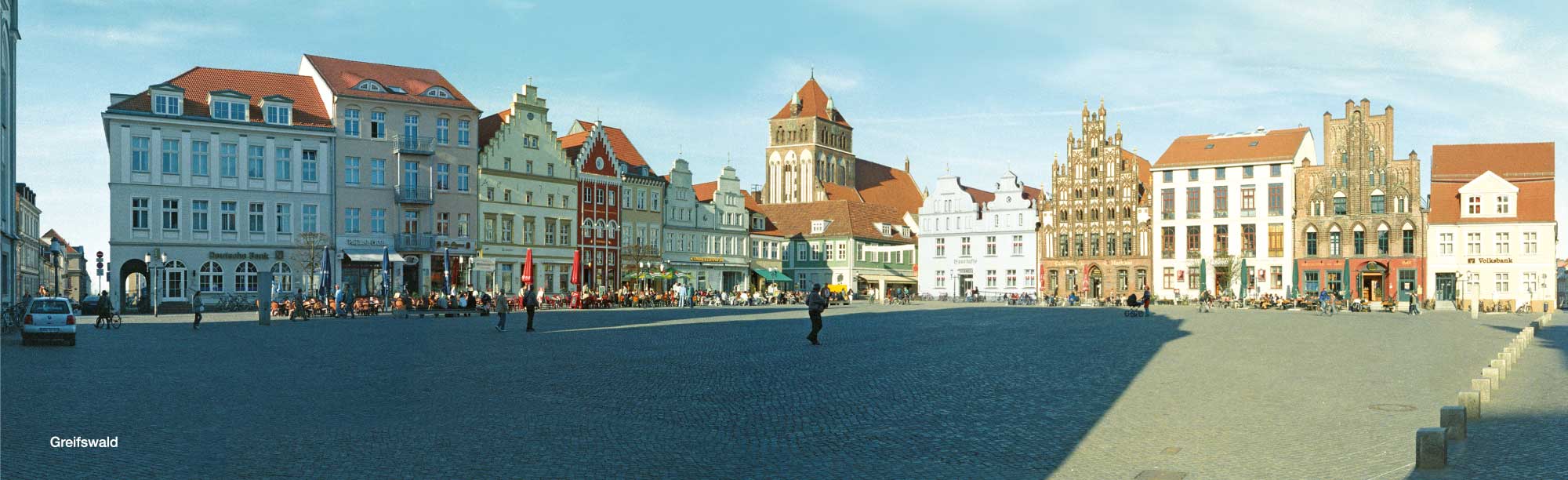 Eines der Panoramen ist der Markt mit Rathaus und dem Dom St. Nikolai im Hintergrund. Ebenso dabei ist St. Marien, die prächtige Backsteingotische Kirche. Dazu kommt ein Panorama des Universitäts-Hauptgebäudes und weitere Panoramen für ein schönes Stadtportrait von Greifswald.