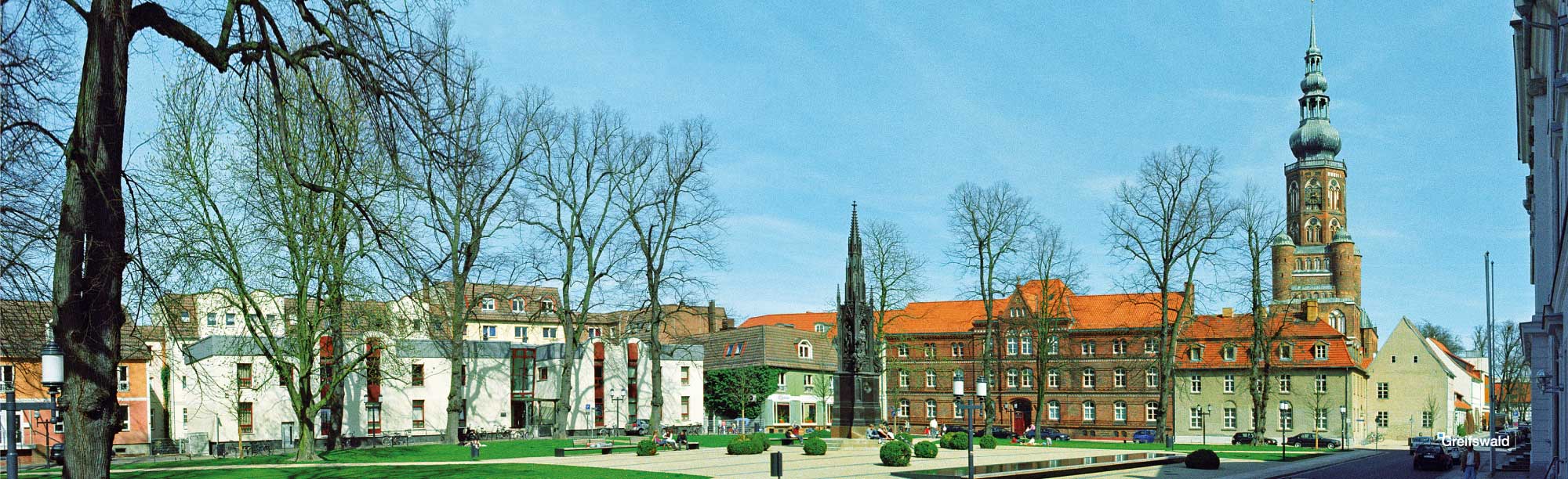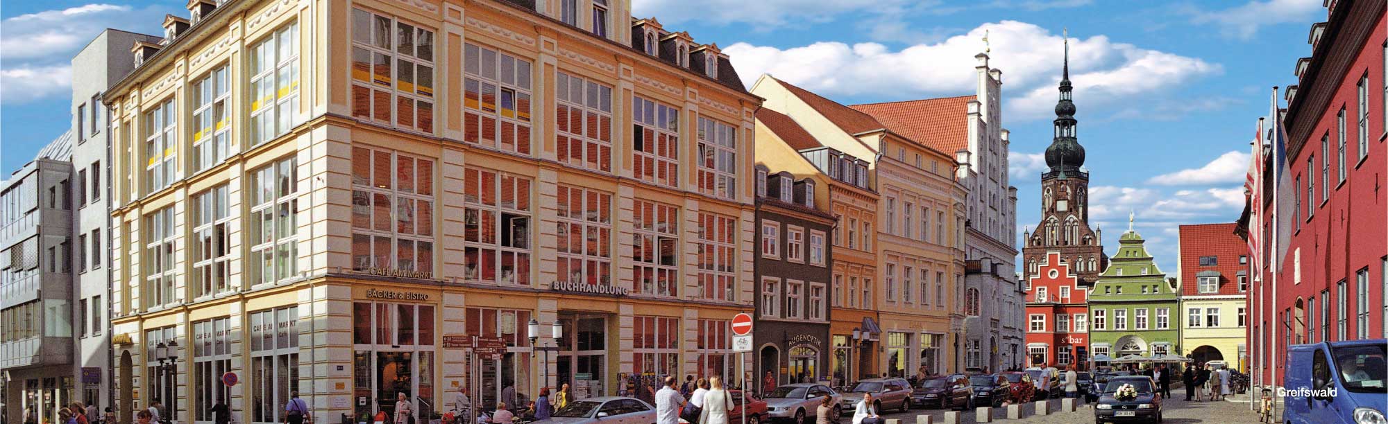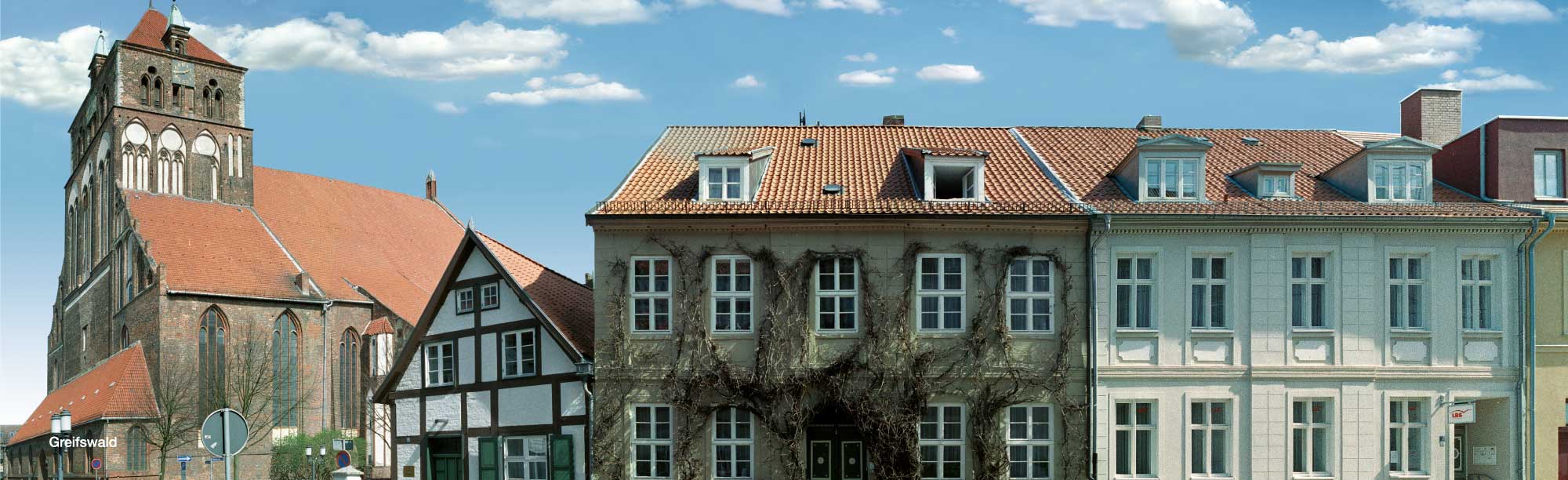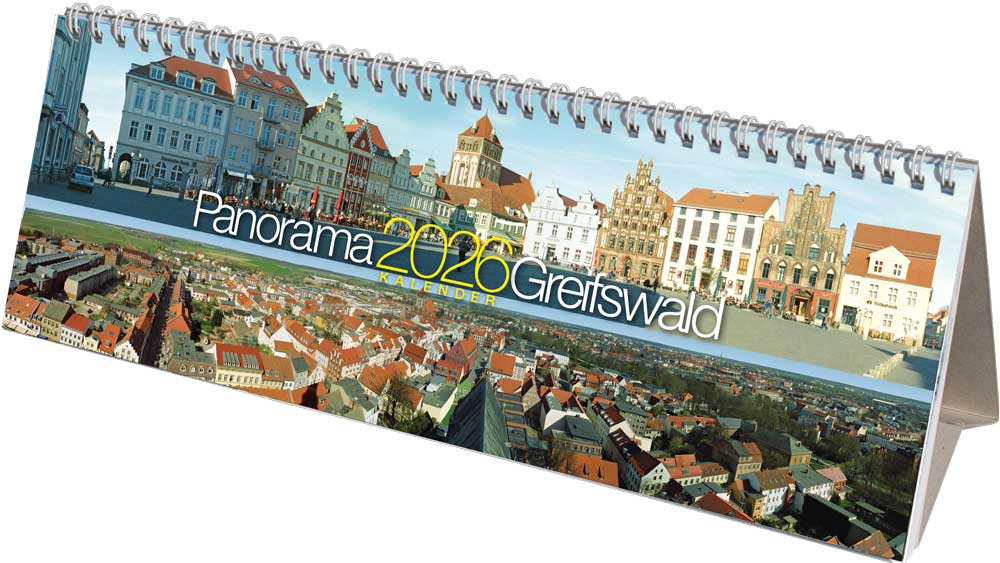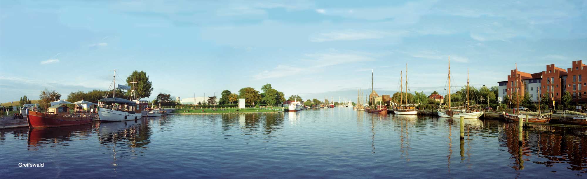 Eines der Panoramen ist der Markt mit Rathaus und dem Dom St. Nikolai im Hintergrund. Ebenso dabei ist St. Marien, die prächtige Backsteingotische Kirche. Dazu kommt ein Panorama des Universitäts-Hauptgebäudes und weitere Panoramen für ein schönes Stadtportrait von Greifswald.