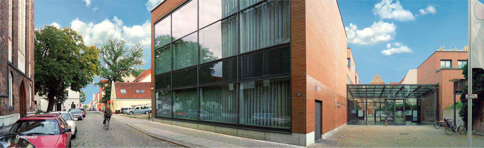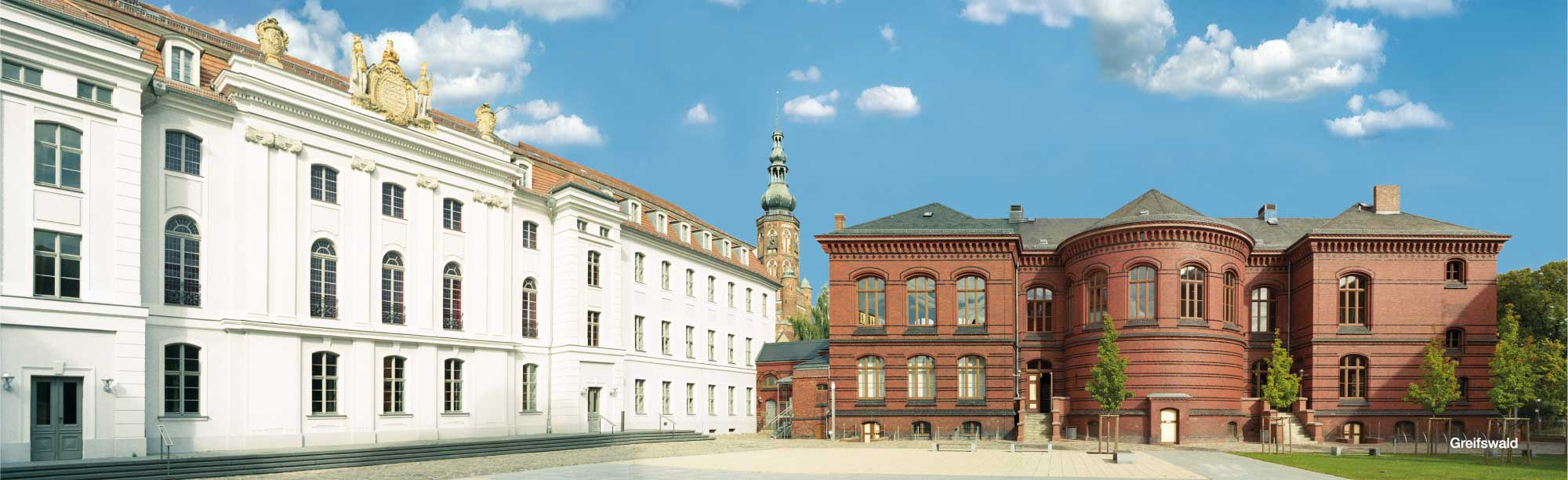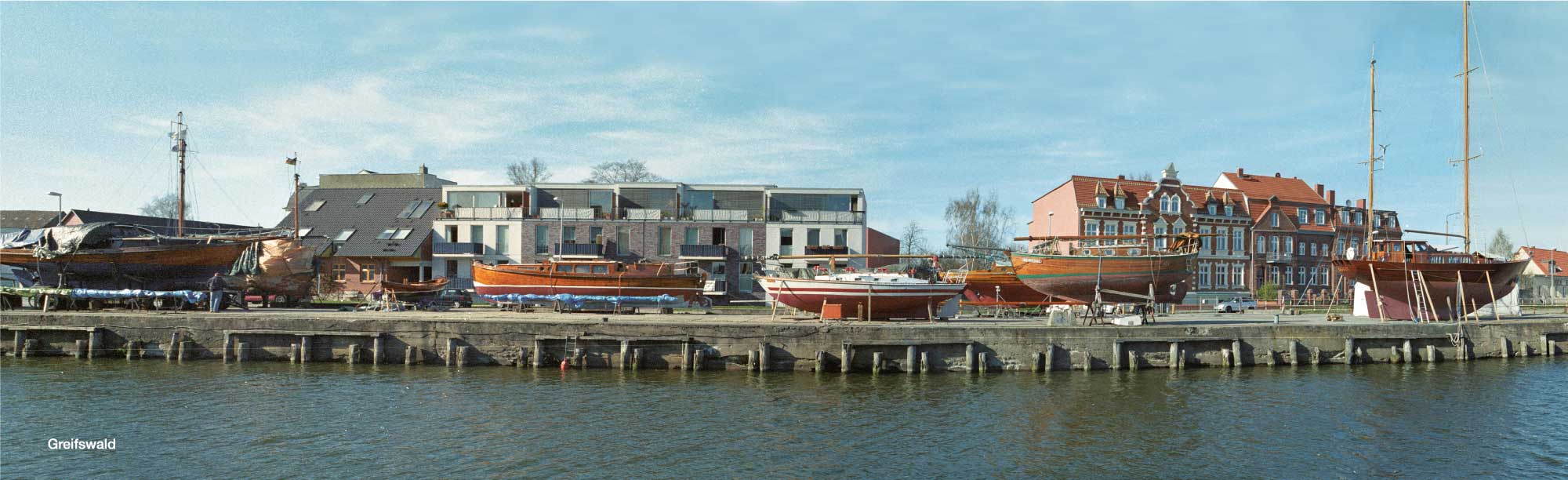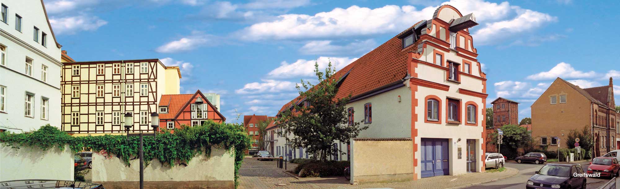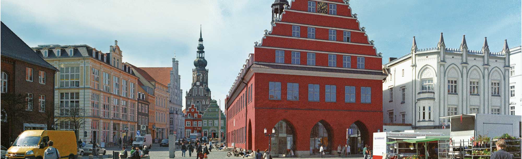 Eines der Panoramen ist der Markt mit Rathaus und dem Dom St. Nikolai im Hintergrund. Ebenso dabei ist St. Marien, die prächtige Backsteingotische Kirche. Dazu kommt ein Panorama des Universitäts-Hauptgebäudes und weitere Panoramen für ein schönes Stadtportrait von Greifswald.