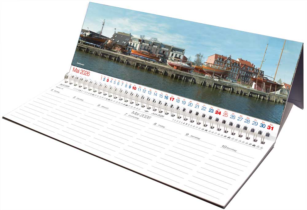 Mit 52 Seiten für Termineinträge. Der Planer liegt nicht nur flach auf dem Schreibtisch, um Termineinträge vorzunehmen: Der Planer ist ein Aufstellkalender mit dem aufgestellten Panoramafoto, das wöchentlich wechselt.