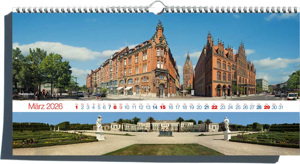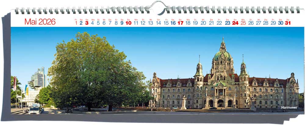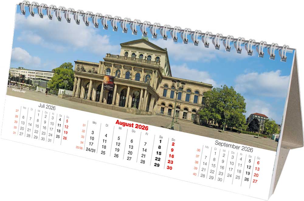 Mit 52 Seiten für Termineinträge. Der Planer liegt nicht nur flach auf dem Schreibtisch, um Termineinträge vorzunehmen: Der Planer ist ein Aufstellkalender mit dem aufgestellten Panoramafoto, das wöchentlich wechselt.