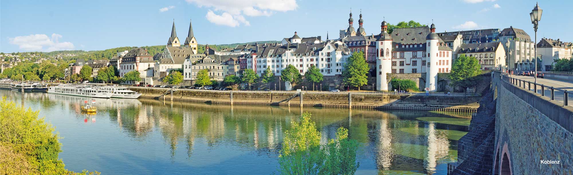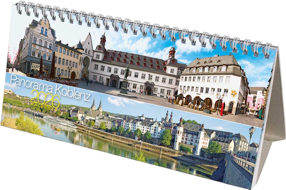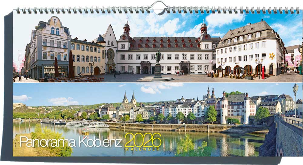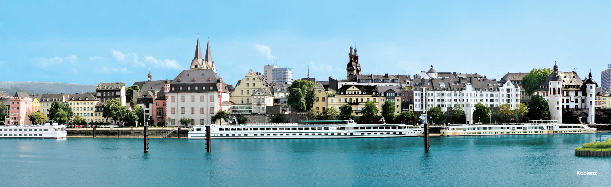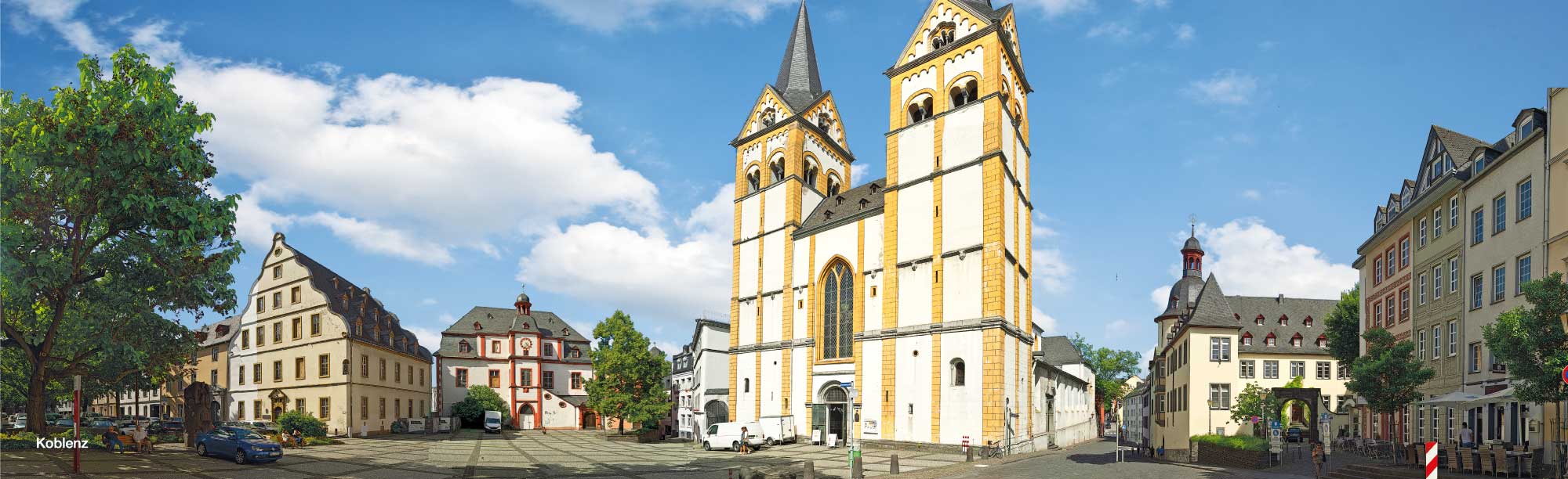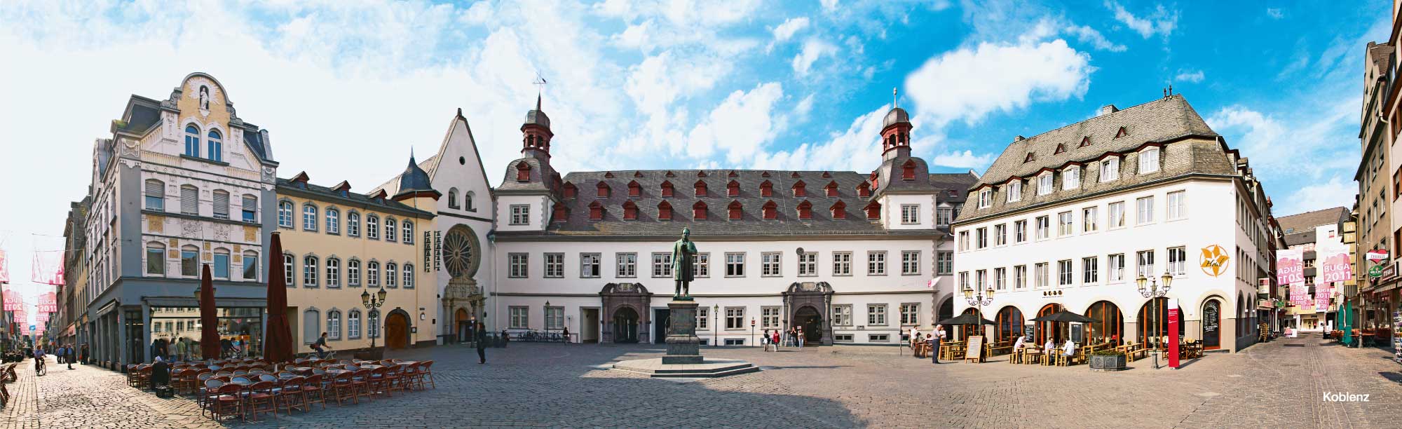 Die an der Mosel liegende Alte Burg und das Moselufer mit anliegenden Schiffen - alle zusammen werden auf einem Panorama dargestellt. Die Basilika St. Castor mit Umgebung, der Zusammenfluss von Rhein und Mosel von der Festung Ehrenbreitsein aus gesehen sind ebenso dabei, sowie weitere Panoramen der Koblenzer Innenstadt.