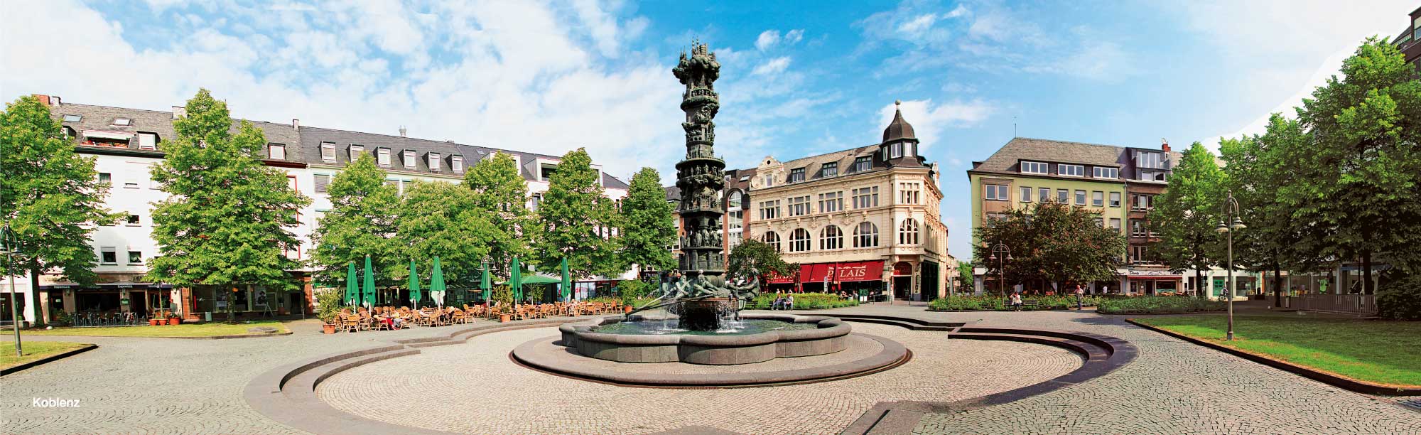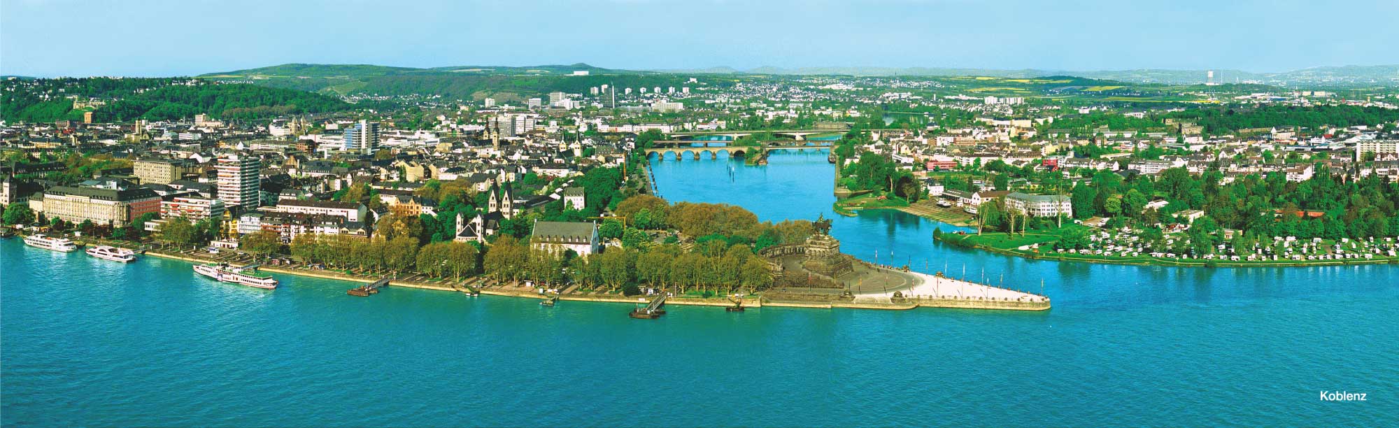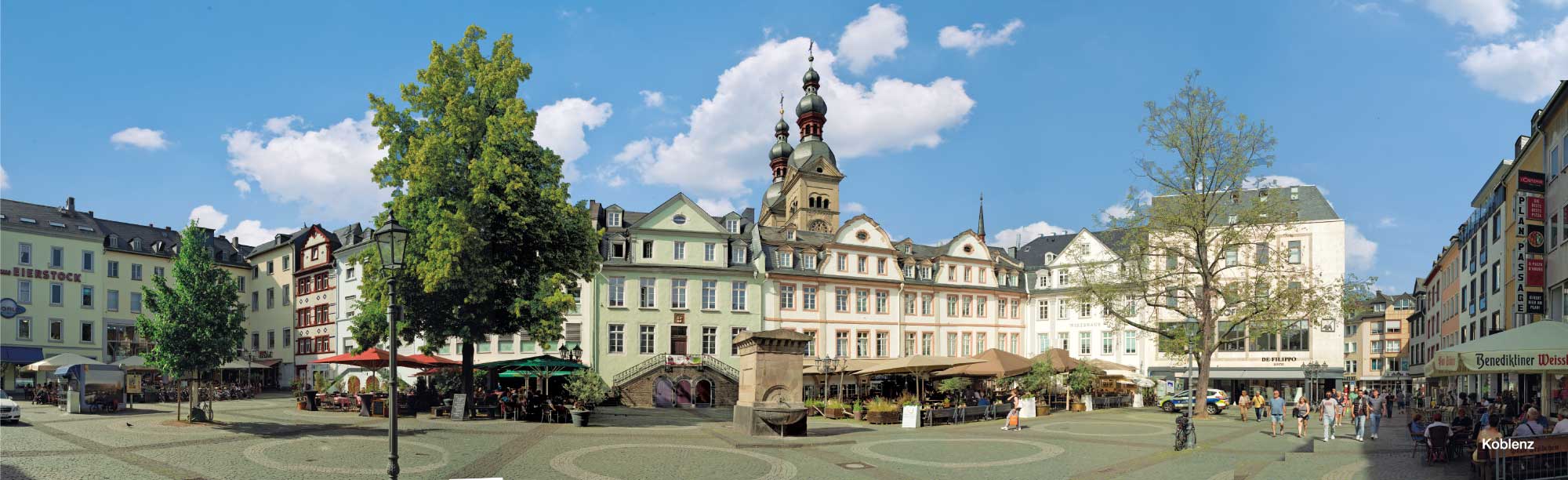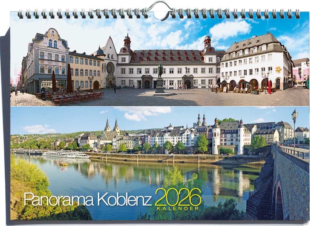 Die an der Mosel liegende Alte Burg und das Moselufer mit anliegenden Schiffen - alle zusammen werden auf einem Panorama dargestellt. Die Basilika St. Castor mit Umgebung, der Zusammenfluss von Rhein und Mosel von der Festung Ehrenbreitsein aus gesehen sind ebenso dabei, sowie weitere Panoramen der Koblenzer Innenstadt.