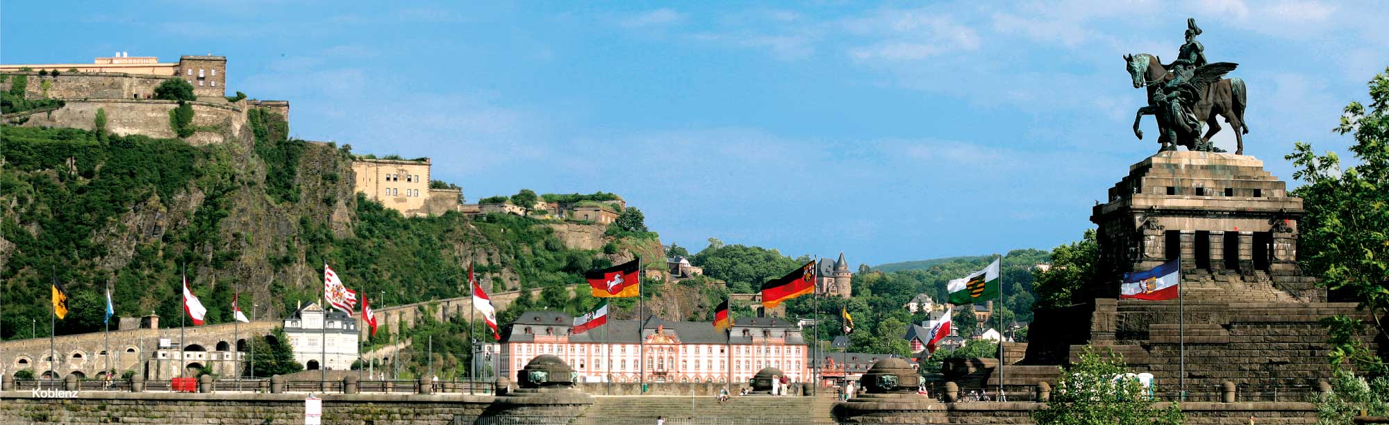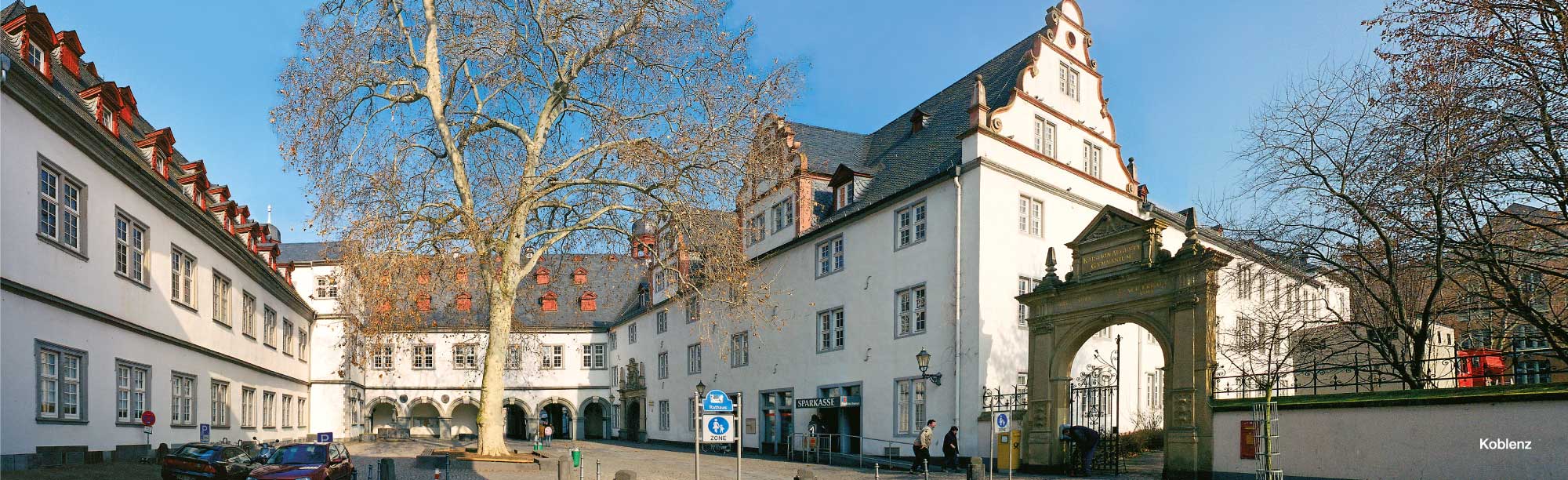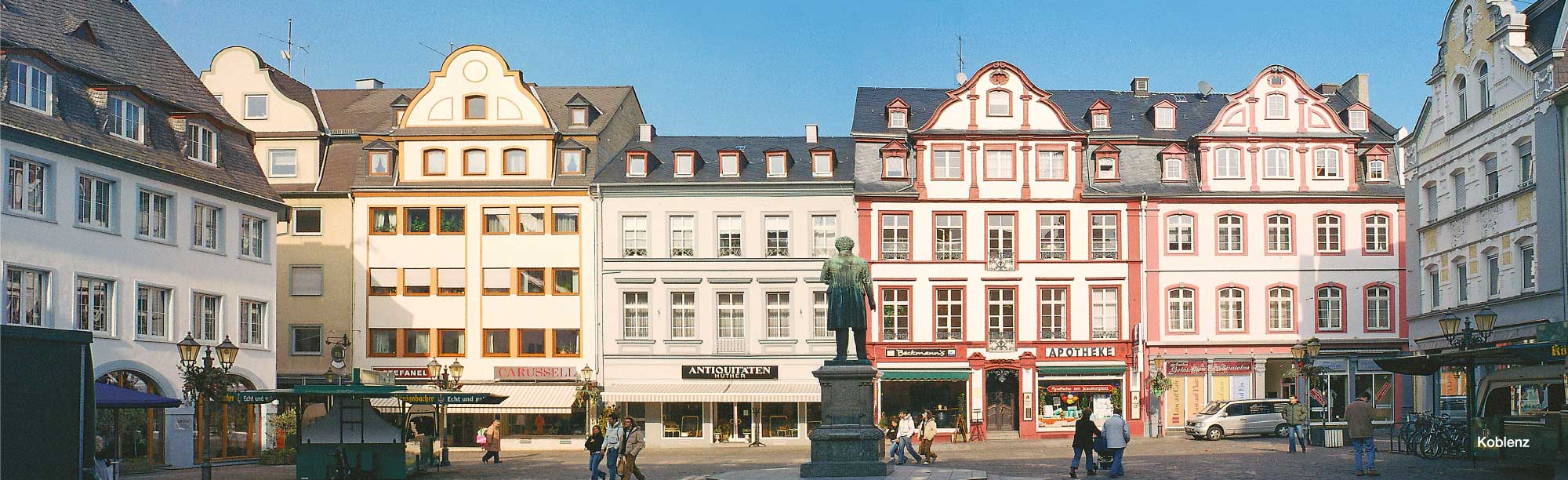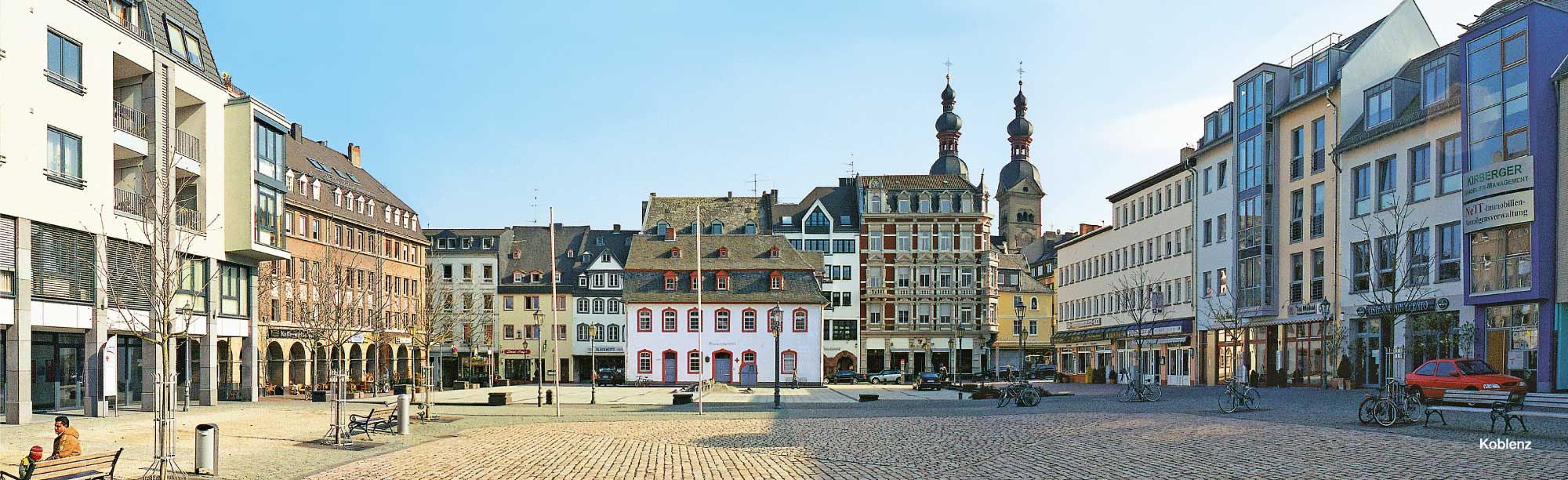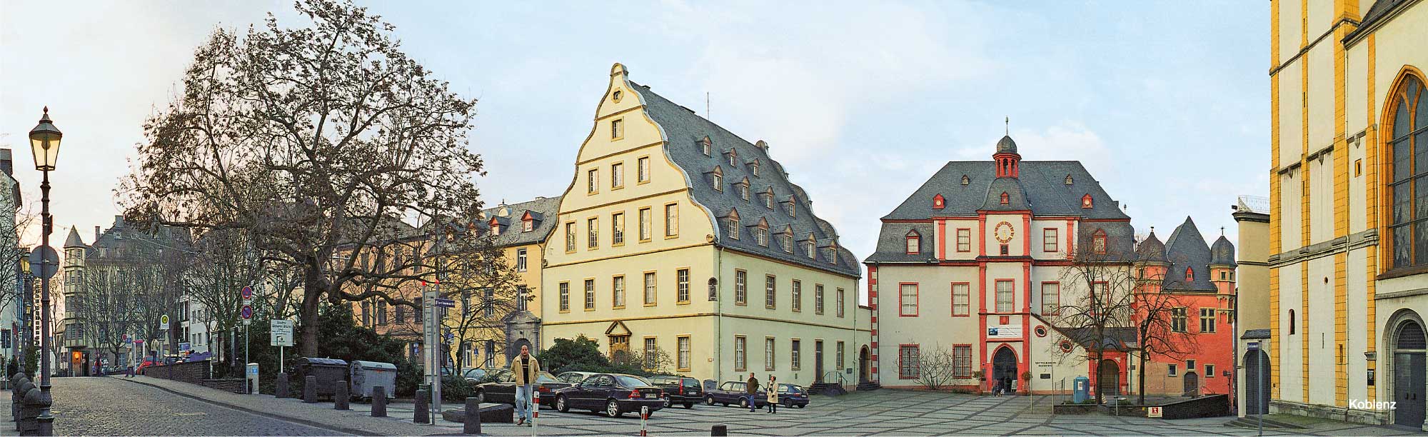 Die an der Mosel liegende Alte Burg und das Moselufer mit anliegenden Schiffen - alle zusammen werden auf einem Panorama dargestellt. Die Basilika St. Castor mit Umgebung, der Zusammenfluss von Rhein und Mosel von der Festung Ehrenbreitsein aus gesehen sind ebenso dabei, sowie weitere Panoramen der Koblenzer Innenstadt.