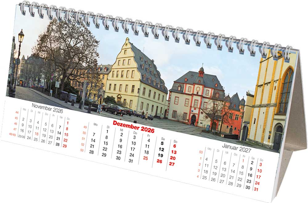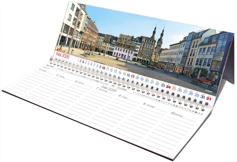 Mit 52 Seiten für Termineinträge. Der Planer liegt nicht nur flach auf dem Schreibtisch, um Termineinträge vorzunehmen: Der Planer ist ein Aufstellkalender mit dem aufgestellten Panoramafoto, das wöchentlich wechselt.