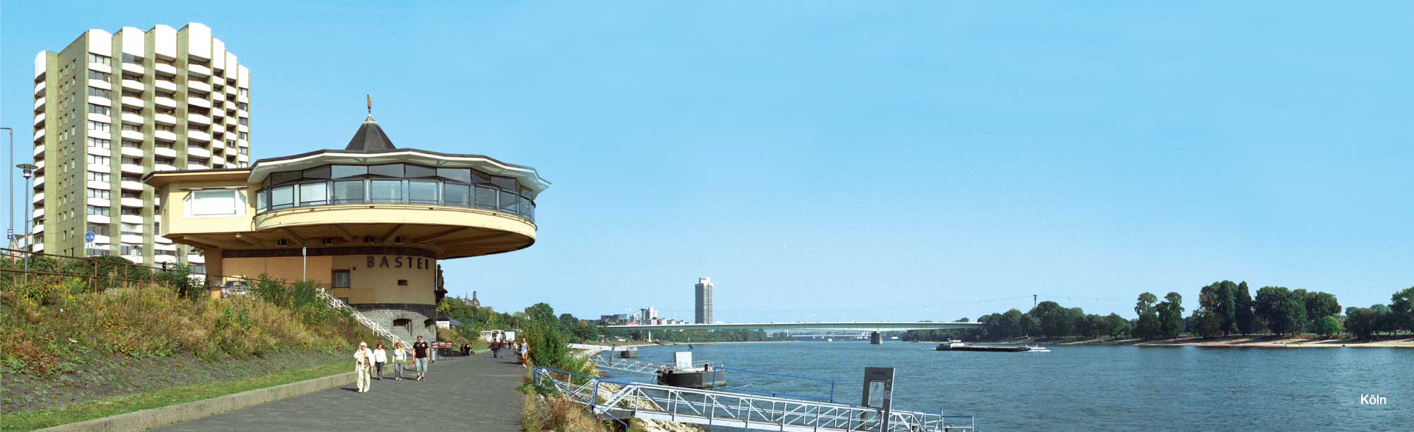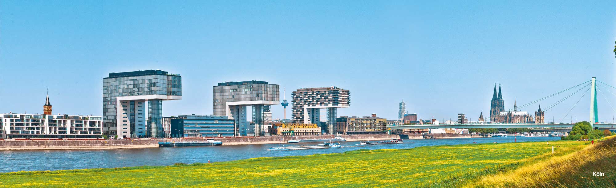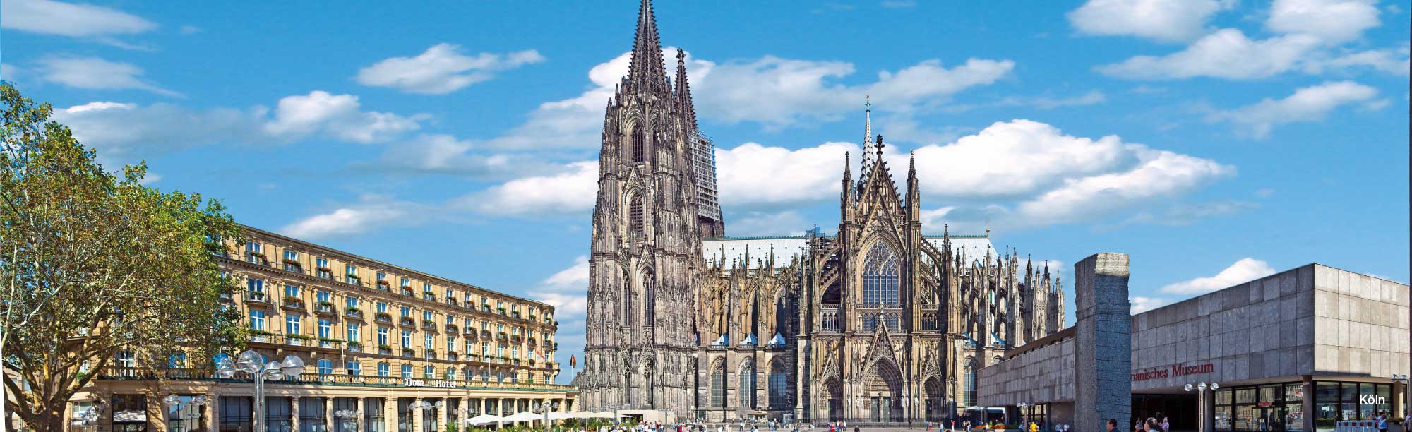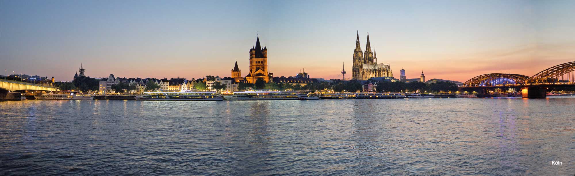 Der Kölner Dom mit dem Vorplatz, dem Römisch-Germanischen Museum rechts und dem Dom Hotel links: alles zusammen auf einem Panorama. Weitere Panoramen mit Rundumblick: der Rheinauhafen, das Rheinpanorama mit den Rheinbrücken und Altstadt, St. Martin mit Rheinpromenade.
