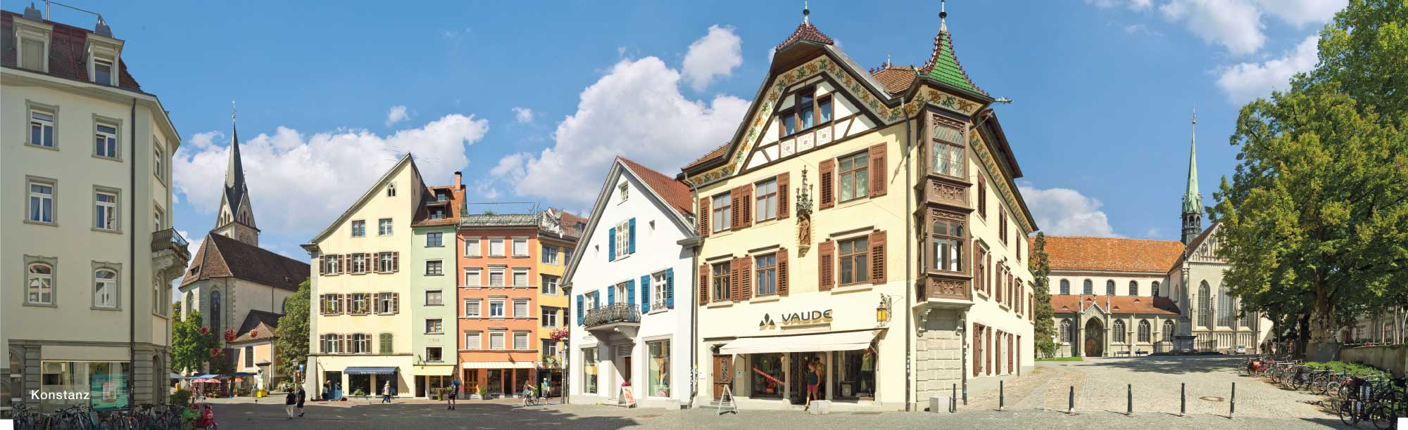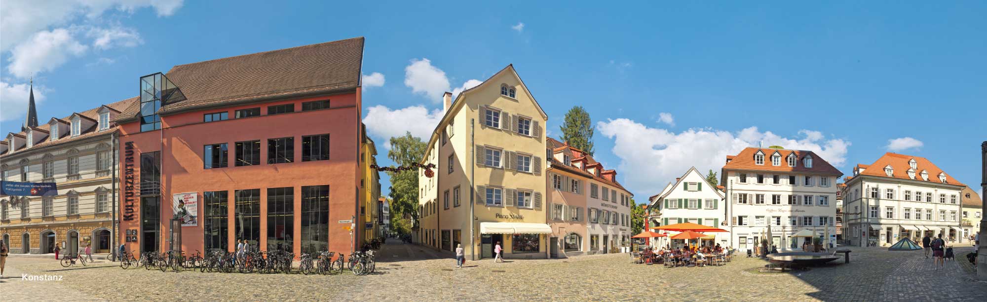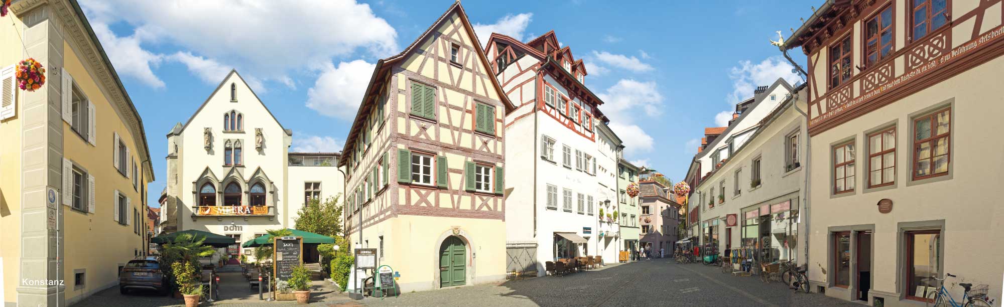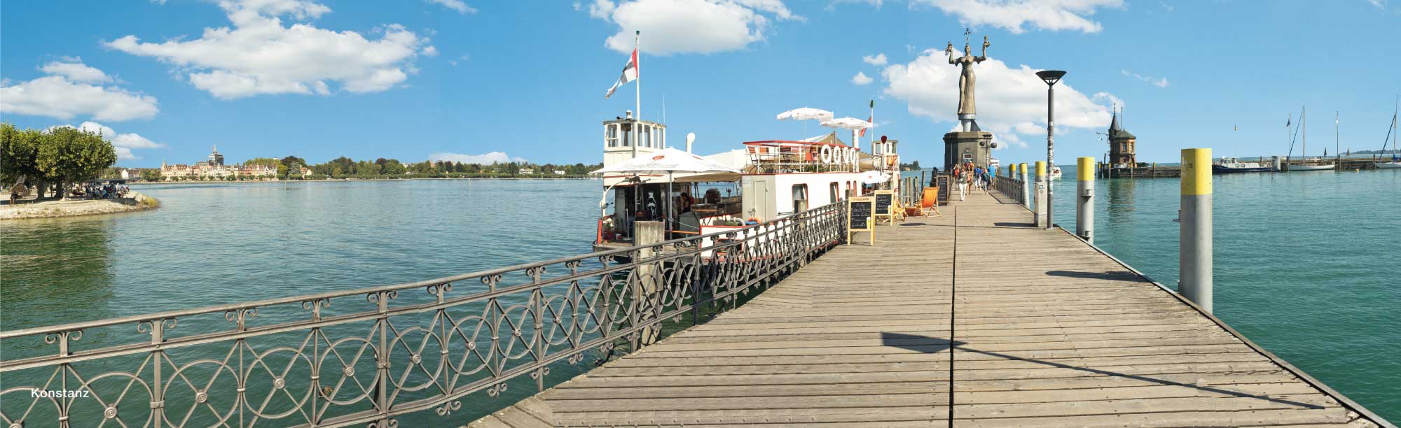 Bodenseeufer mit dem Konzilgebäude und umgebende Landschaft - das ist eines der Motive für das Panorama mit einem Rundblick von mehr als 180 Grad. Auch die Imperia an der Hafeneinfahrt am Bodensee ist im Panorama abgebildet. Dazu kommen Panoramen mit dem Konstanzer Münster und viele Panoramen aus der Altstadt von Konstanz, wie dem Schnetztor.