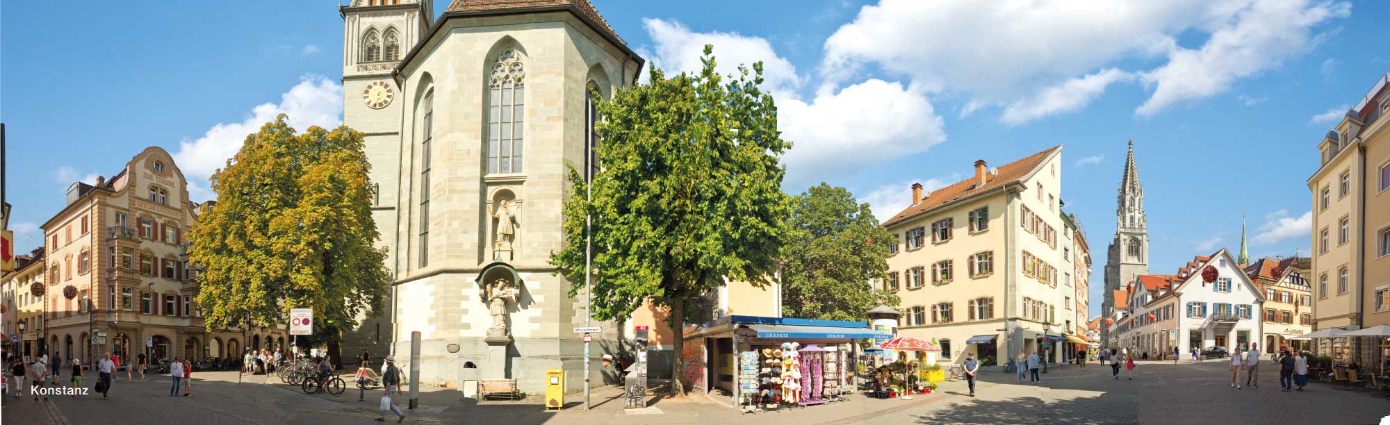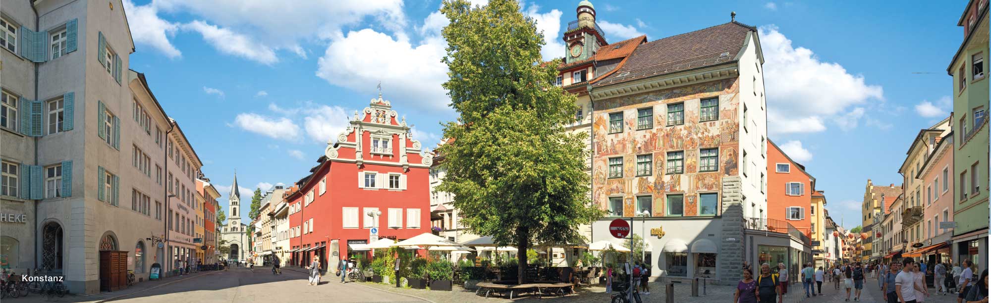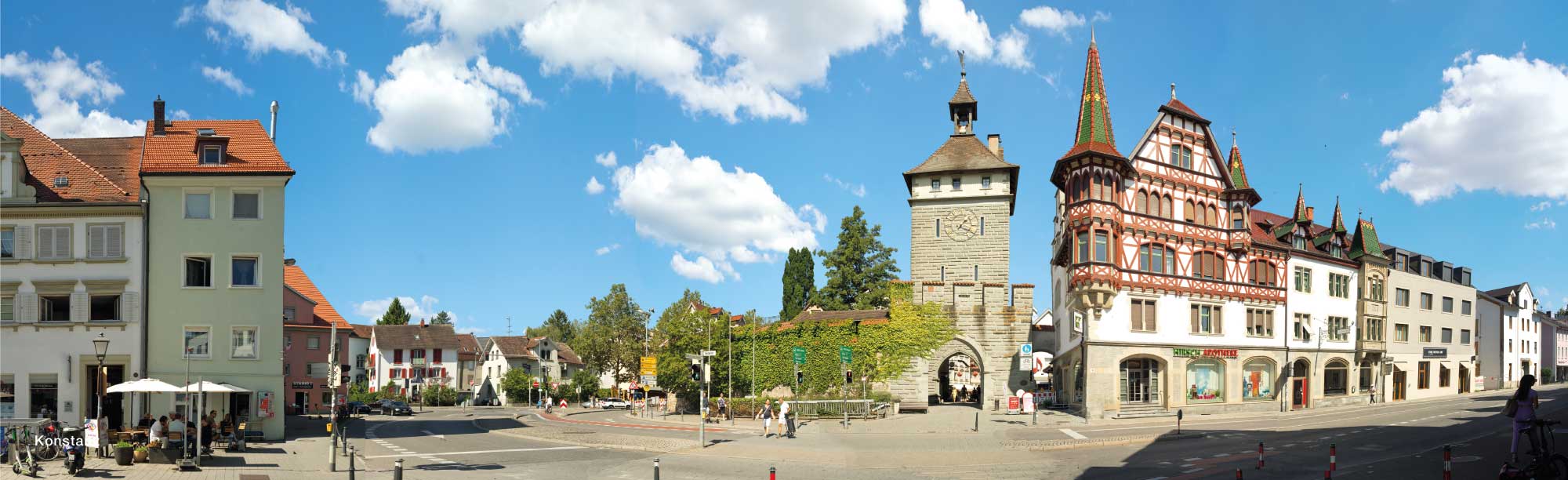Bodenseeufer mit dem Konzilgebäude und umgebende Landschaft - das ist eines der Motive für das Panorama mit einem Rundblick von mehr als 180 Grad. Auch die Imperia an der Hafeneinfahrt am Bodensee ist im Panorama abgebildet. Dazu kommen Panoramen mit dem Konstanzer Münster und viele Panoramen aus der Altstadt von Konstanz, wie dem Schnetztor.