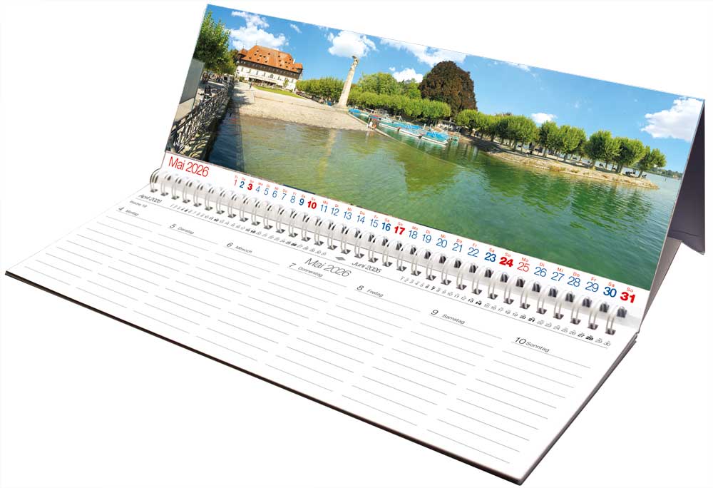 Mit 52 Seiten für Termineinträge. Der Planer liegt nicht nur flach auf dem Schreibtisch, um Termineinträge vorzunehmen: Der Planer ist ein Aufstellkalender mit dem aufgestellten Panoramafoto, das wöchentlich wechselt.