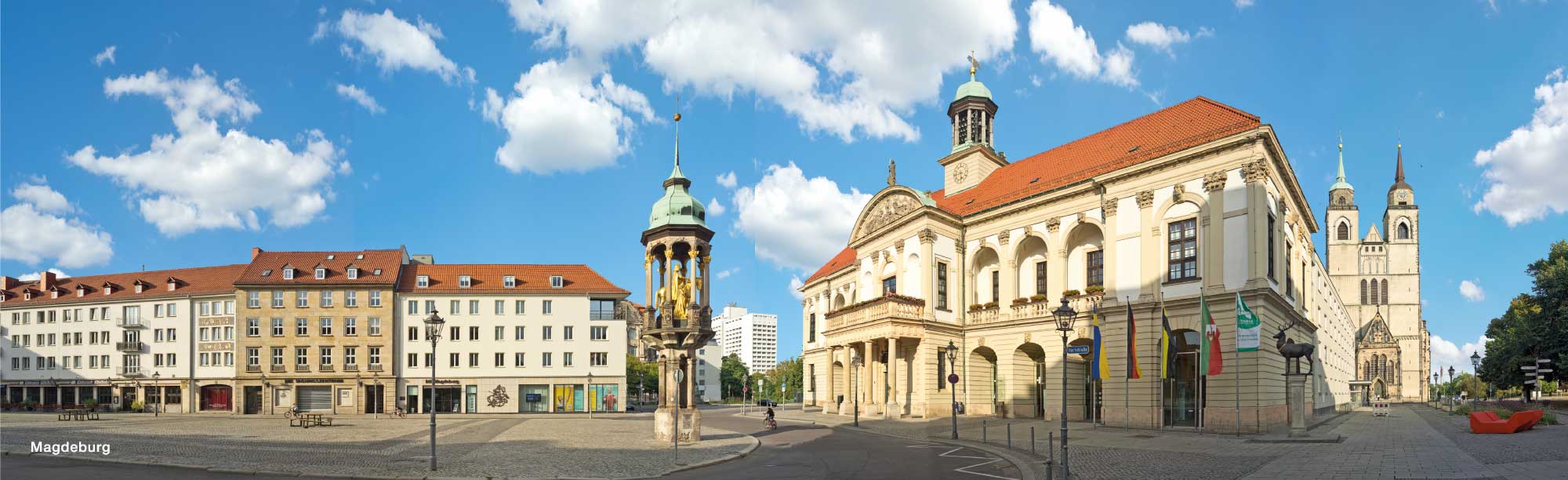 Das Alte Rathaus und der Magdeburger Reiter und der Alte Markt zusammen mit den angrenzen Gebäuden - alles zusammen ist auf einem Panorama abgebildet. Weitere Panoramen mit einem Rundblick von mehr als 180 Grad: das Elpanorama mit der gesamten Altstadt, die Grüne Zitadelle von Hundertwasser, natürlich der Magdeburger Dom mit seiner Umgebung.