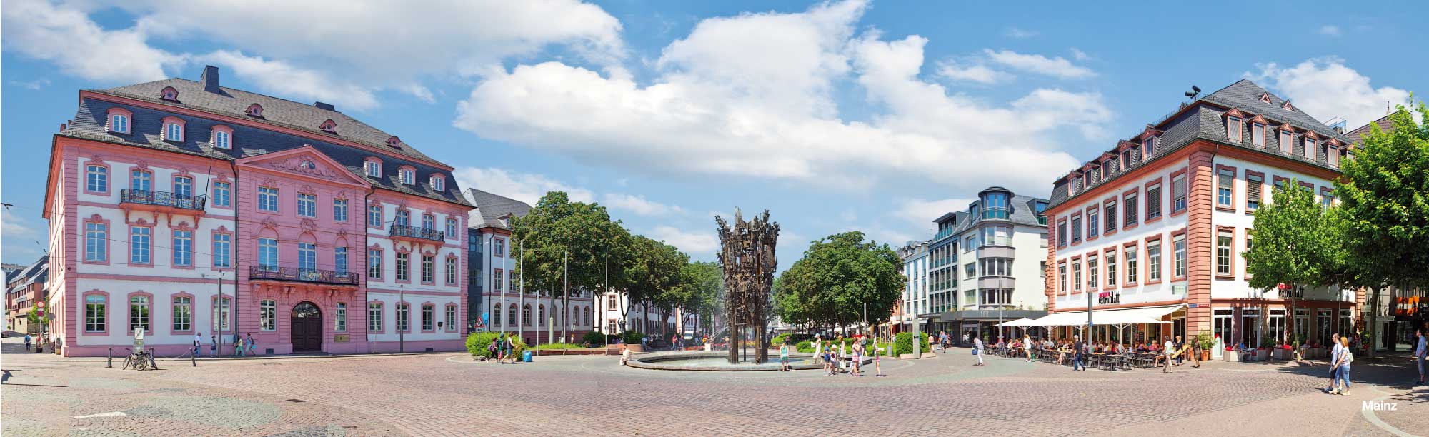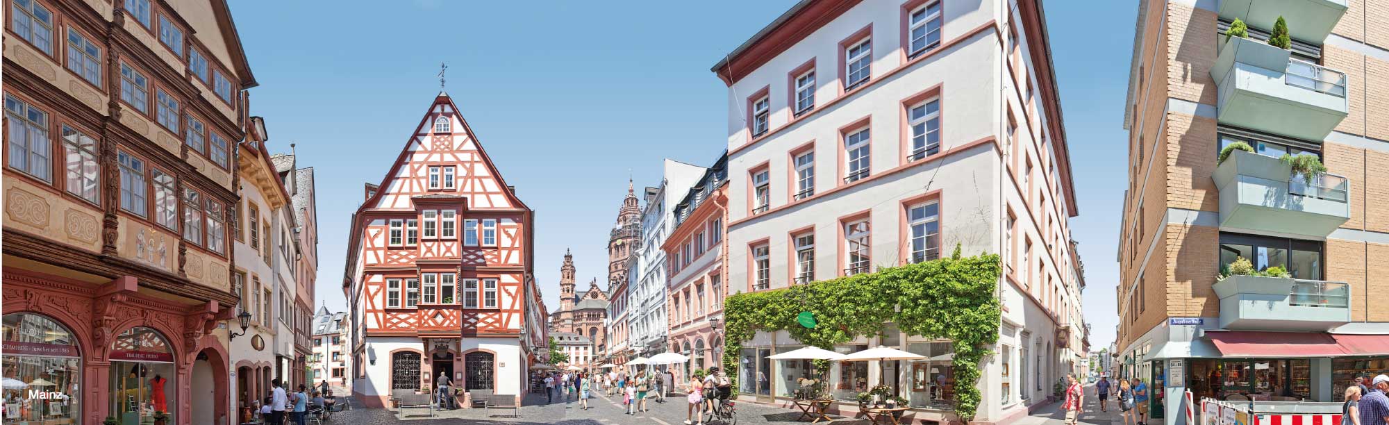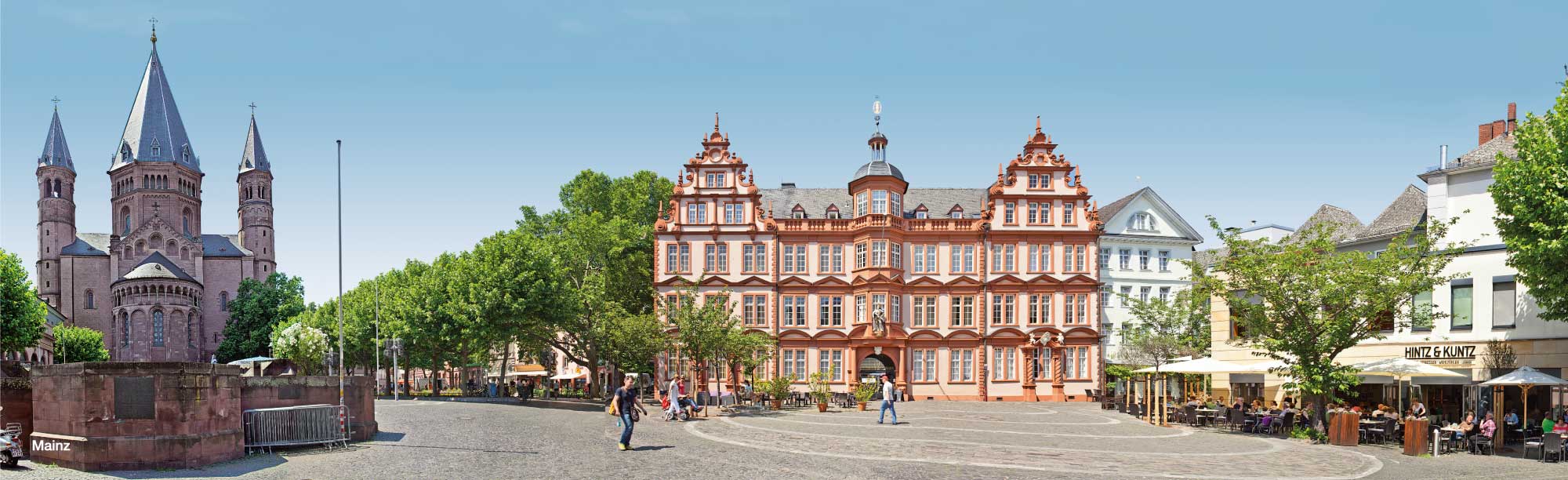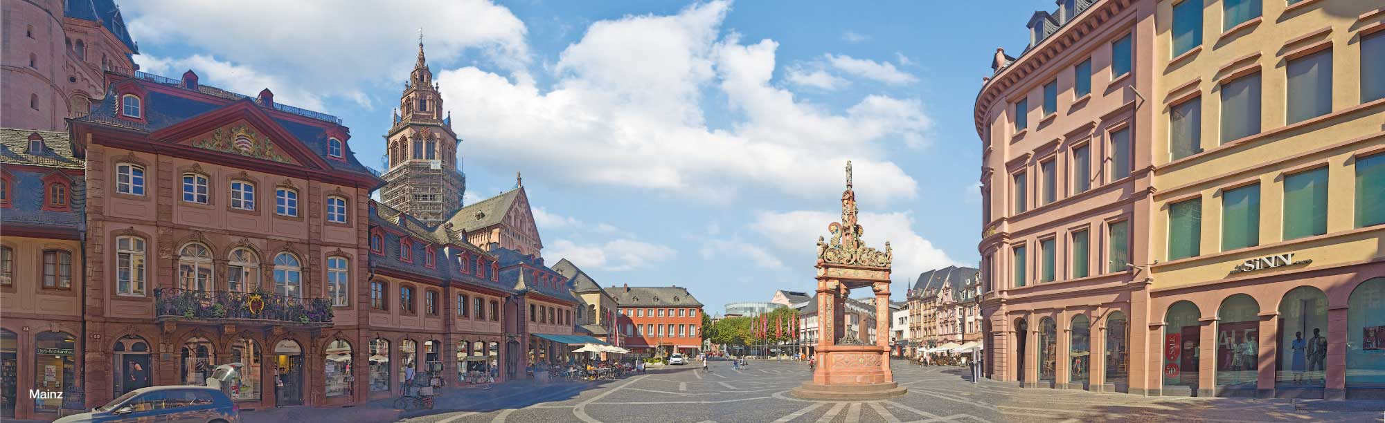 Die Mainzer Altstadt mit Teilen des Doms im Hintergrund ist eines der Panoramen mit einem Blickwinkel von mehr als 180 Grad. Der Dom St. Martin und der Markt mit der Heunensäule, der Gutenbergplatz in seiner Länge und weitere Panoramen von Mainz werden gezeigt.