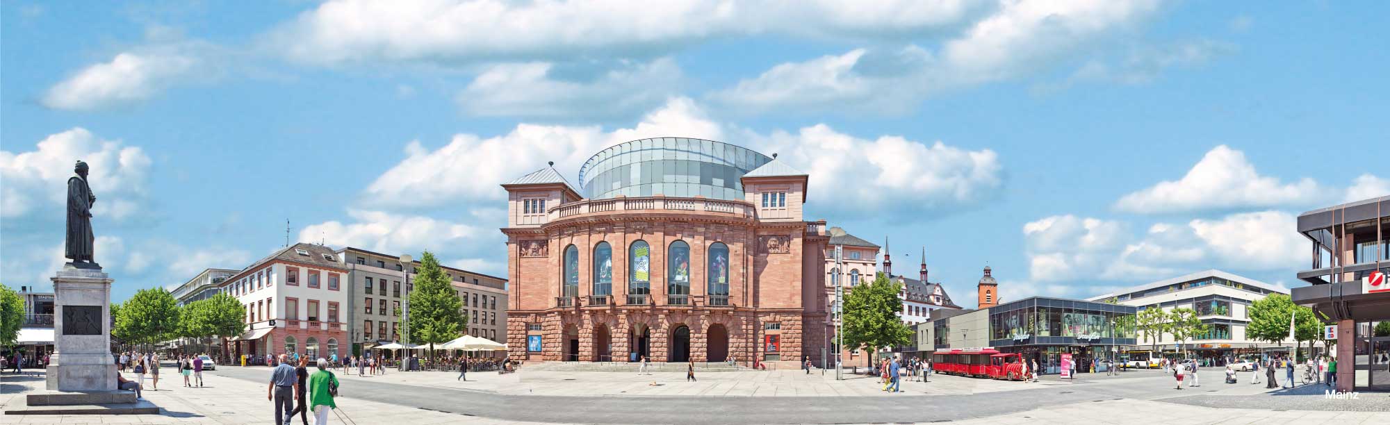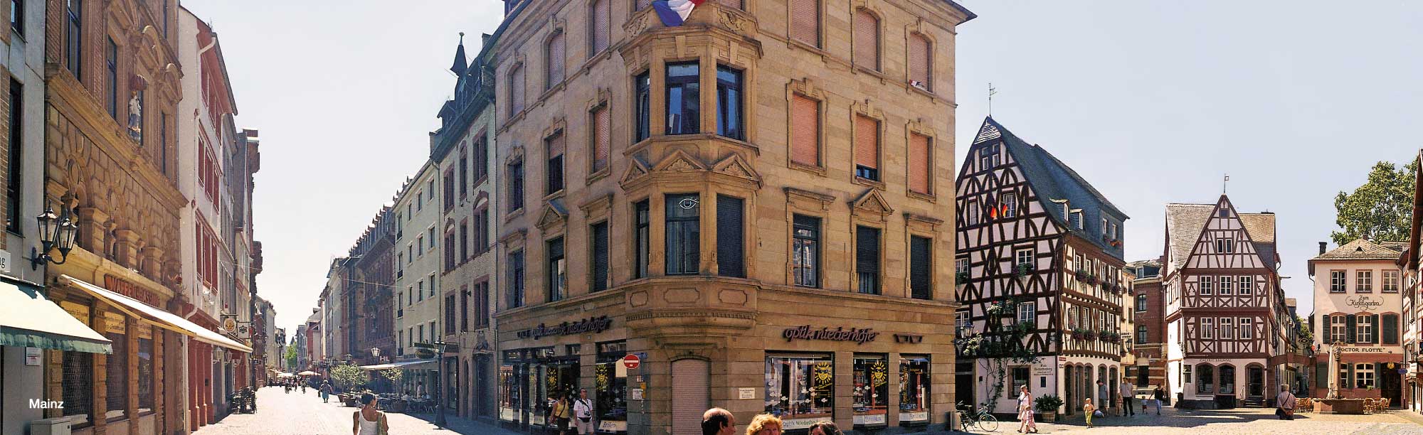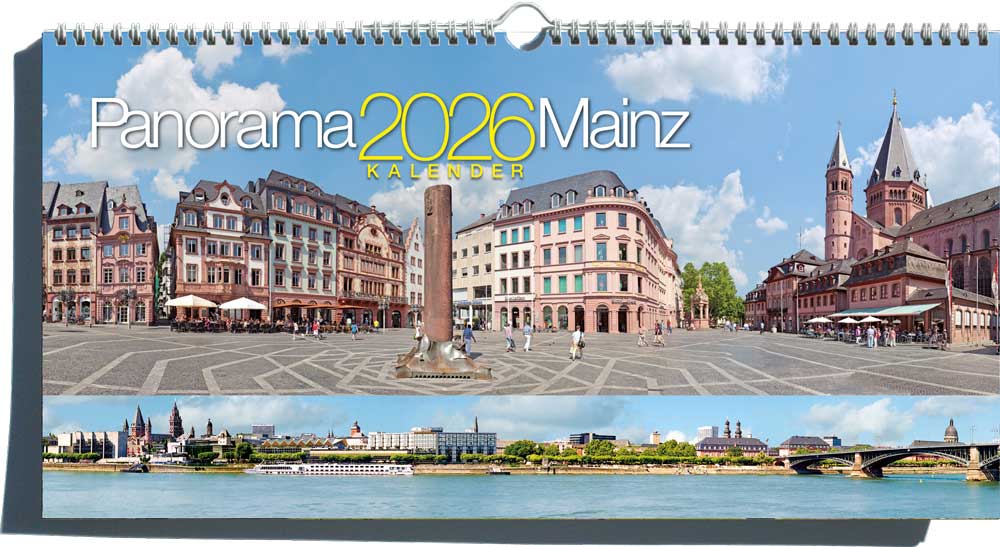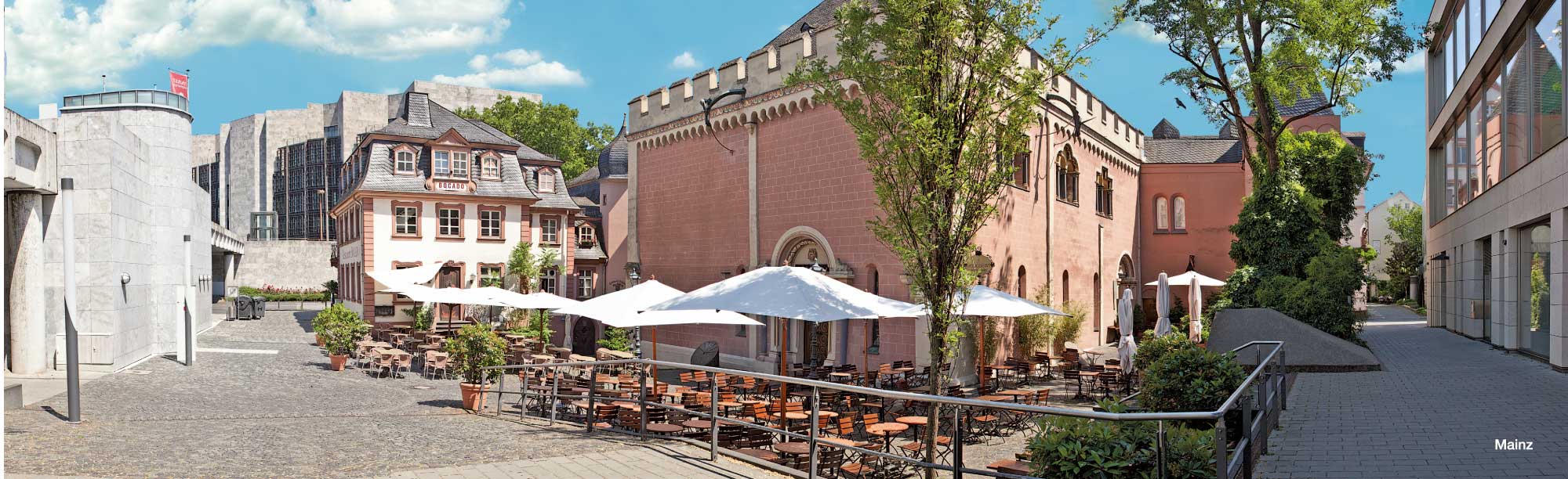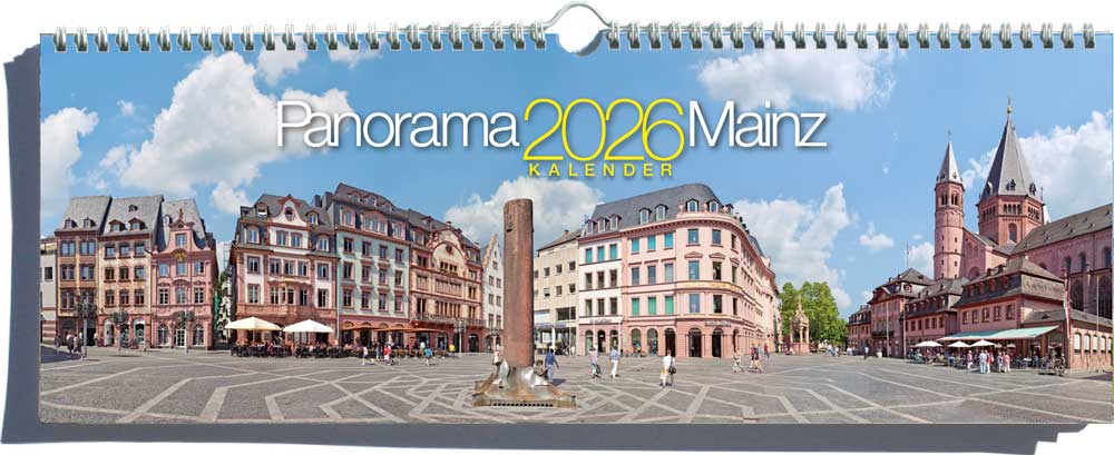 Die Mainzer Altstadt mit Teilen des Doms im Hintergrund ist eines der Panoramen mit einem Blickwinkel von mehr als 180 Grad. Der Dom St. Martin und der Markt mit der Heunensäule, der Gutenbergplatz in seiner Länge und weitere Panoramen von Mainz werden gezeigt.