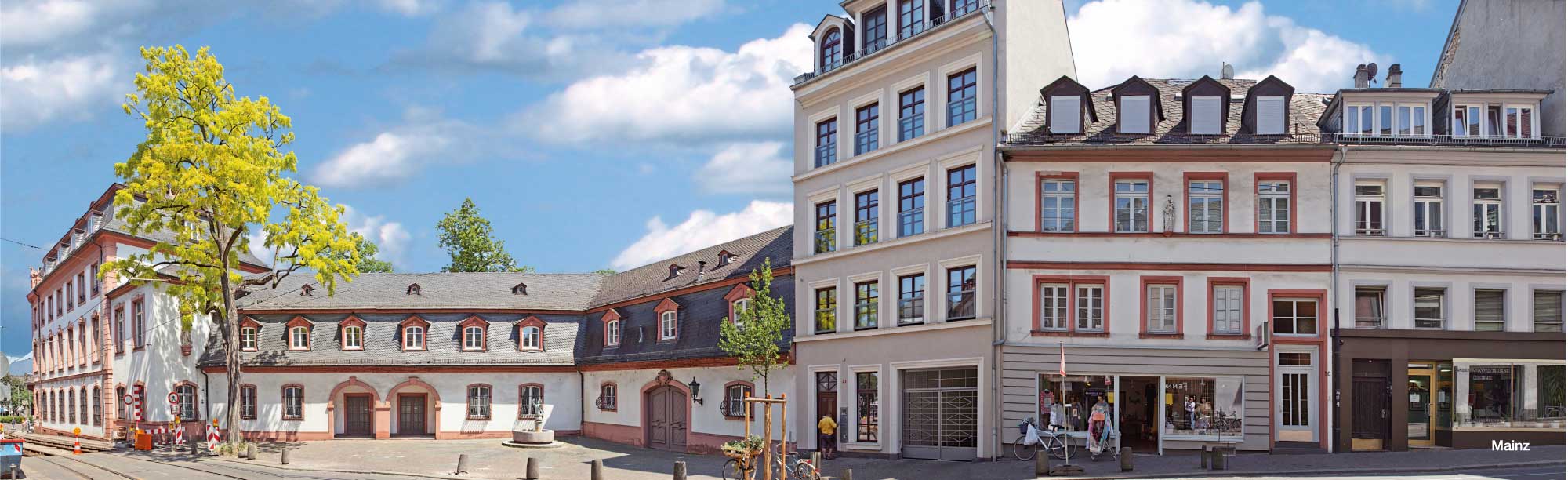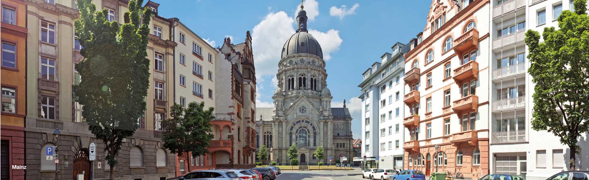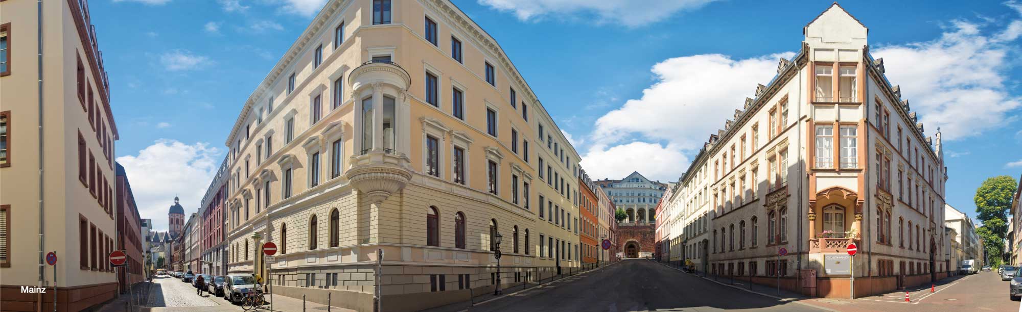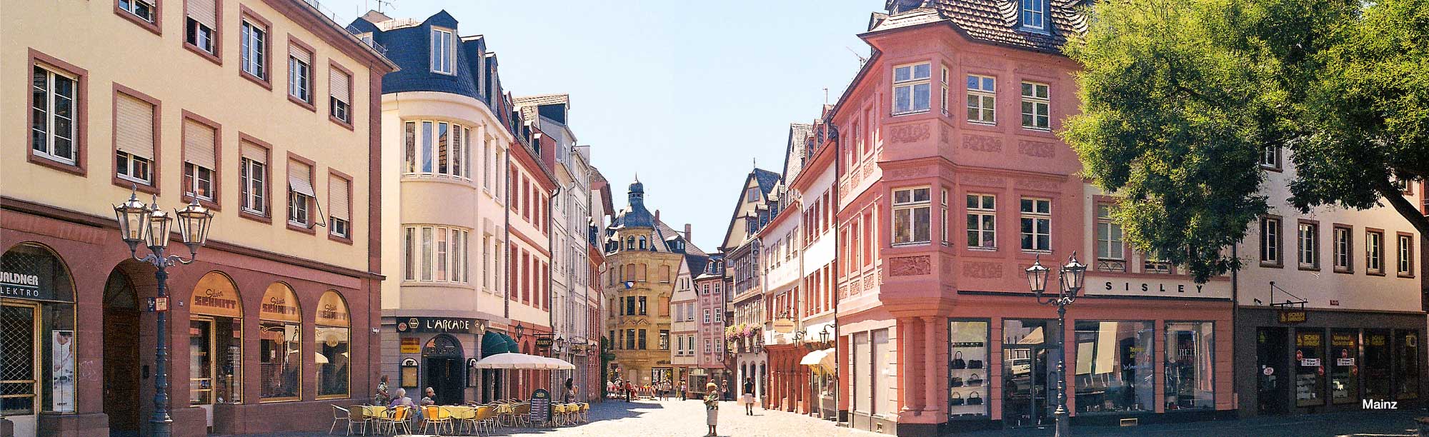 Die Mainzer Altstadt mit Teilen des Doms im Hintergrund ist eines der Panoramen mit einem Blickwinkel von mehr als 180 Grad. Der Dom St. Martin und der Markt mit der Heunensäule, der Gutenbergplatz in seiner Länge und weitere Panoramen von Mainz werden gezeigt.
