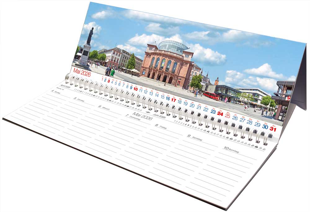 Mit 52 Seiten für Termineinträge. Der Planer liegt nicht nur flach auf dem Schreibtisch, um Termineinträge vorzunehmen: Der Planer ist ein Aufstellkalender mit dem aufgestellten Panoramafoto, das wöchentlich wechselt.