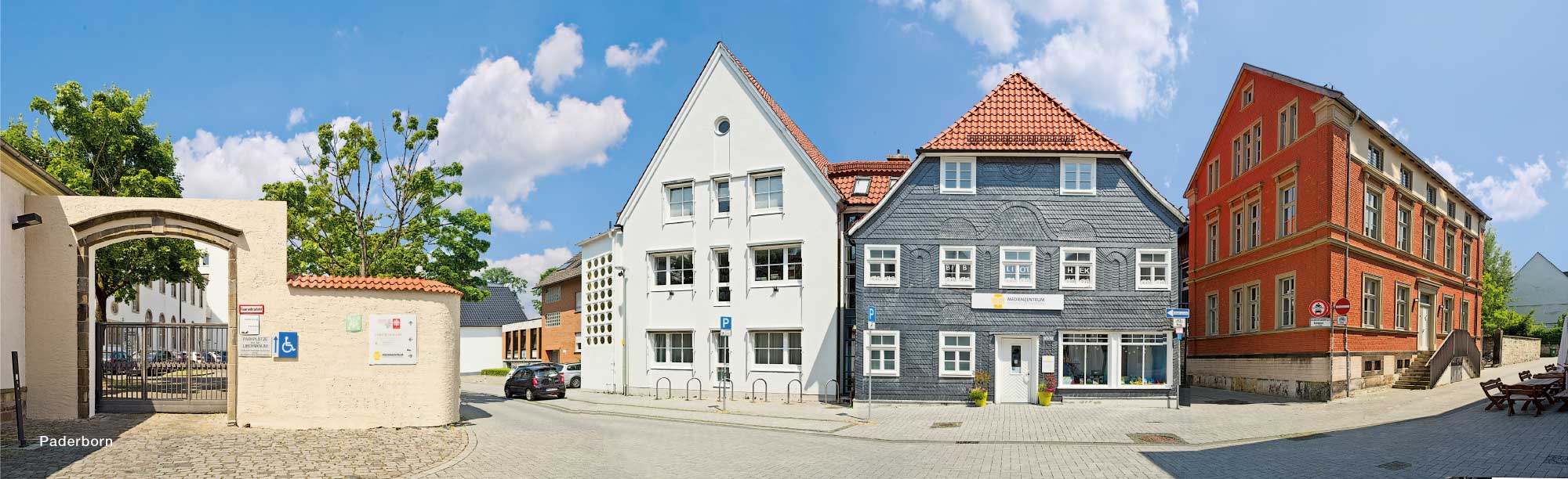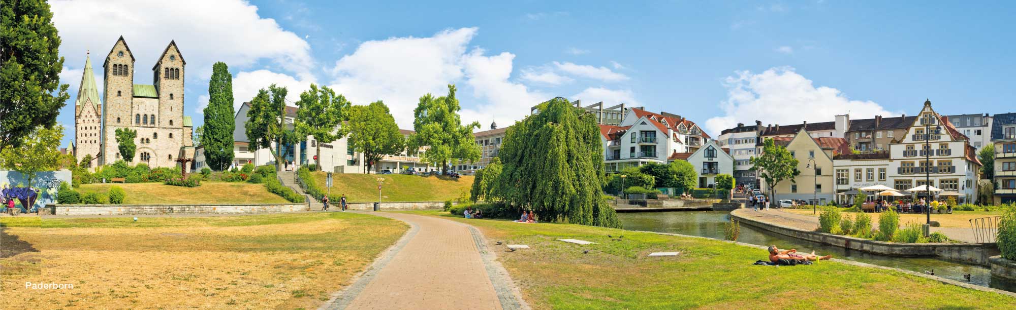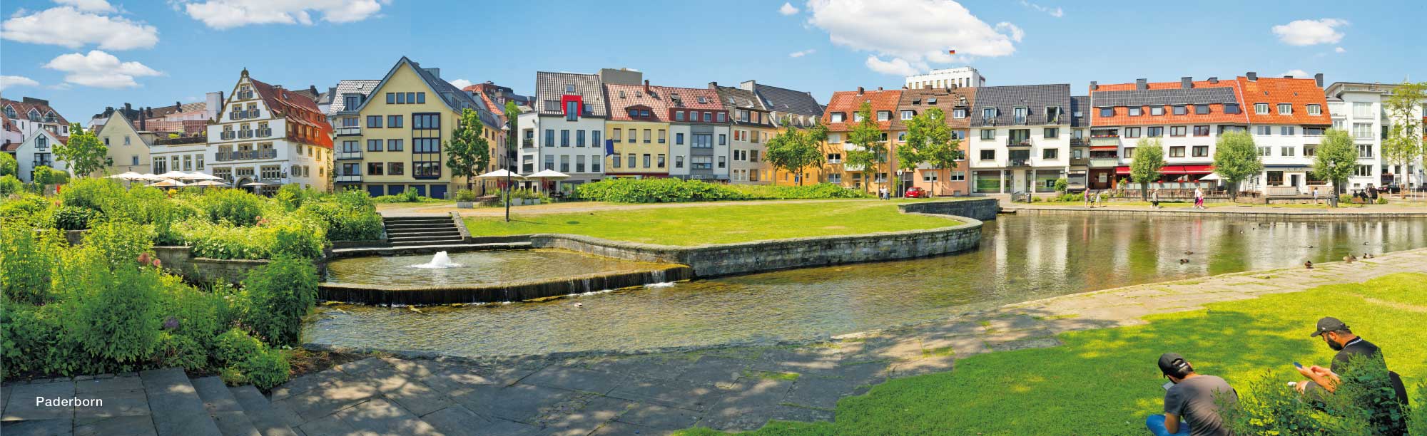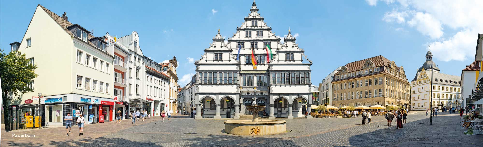 Das idyllische Paderquellgebiet mit umgebenden Gebäuden ist eines der Panoramen, die einen Rundblick von mehr als 180 Grad bieten. Weitere Panoramen von Paderborn: die ottonische Kaiserpfalz, das historische Rathaus und viele weitere.