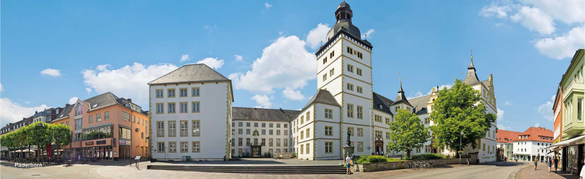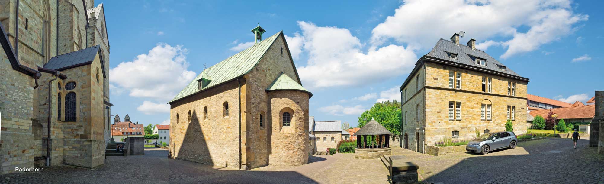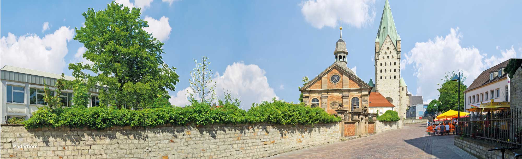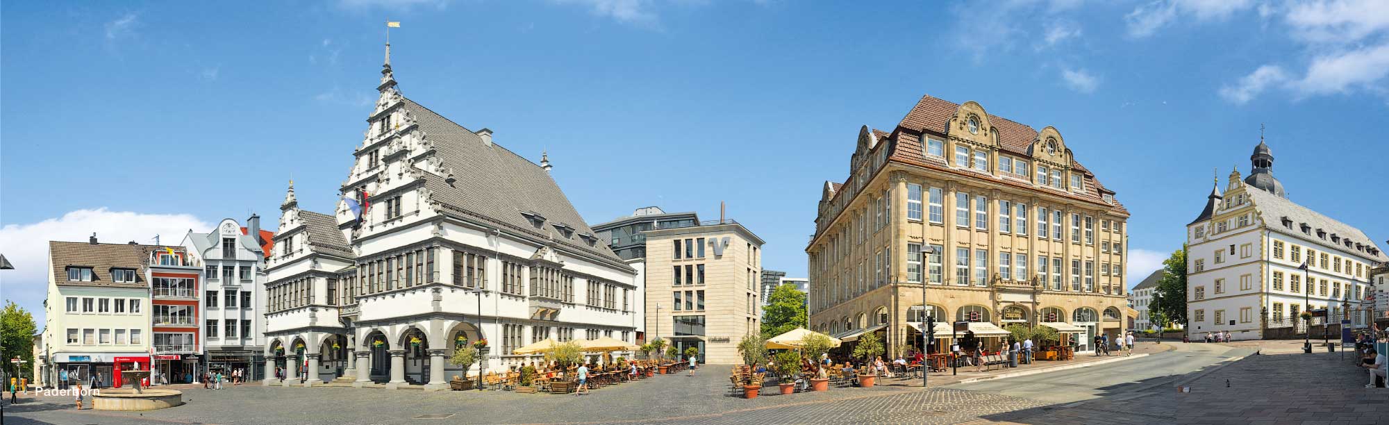 Das idyllische Paderquellgebiet mit umgebenden Gebäuden ist eines der Panoramen, die einen Rundblick von mehr als 180 Grad bieten. Weitere Panoramen von Paderborn: die ottonische Kaiserpfalz, das historische Rathaus und viele weitere.