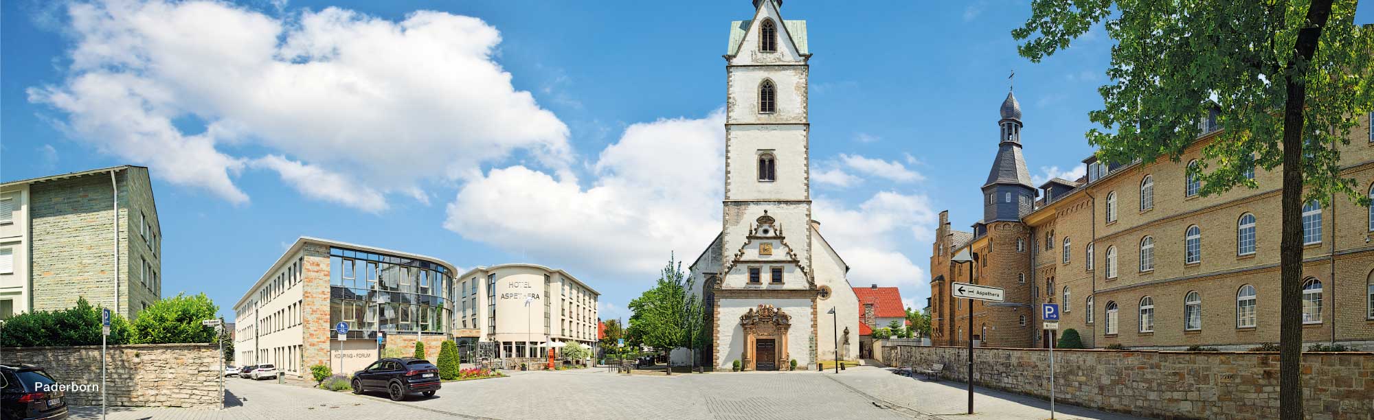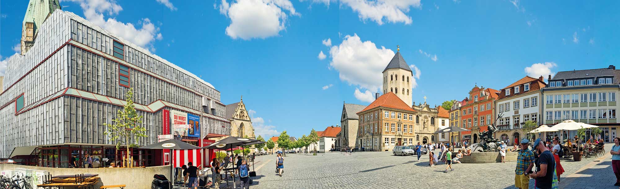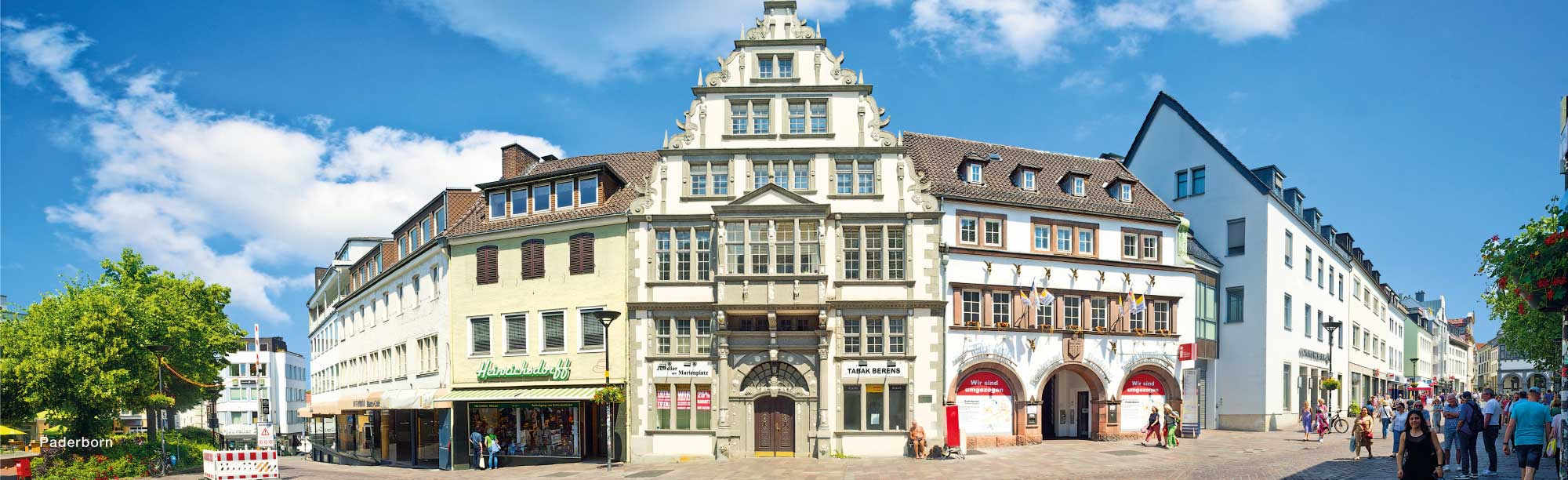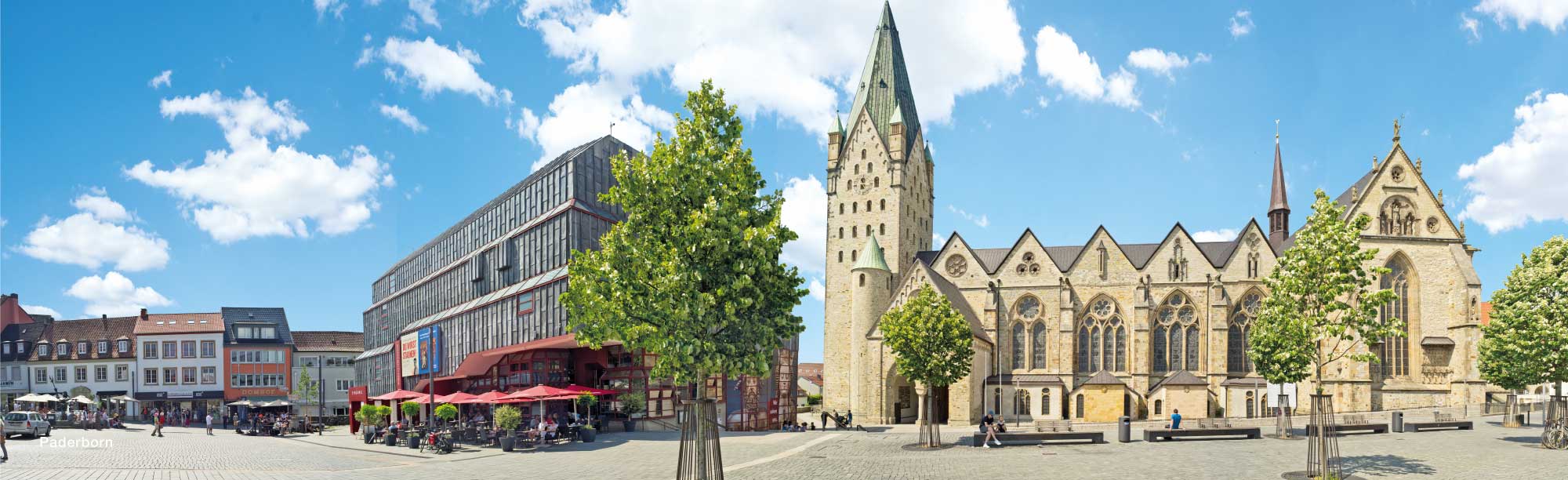 Das idyllische Paderquellgebiet mit umgebenden Gebäuden ist eines der Panoramen, die einen Rundblick von mehr als 180 Grad bieten. Weitere Panoramen von Paderborn: die ottonische Kaiserpfalz, das historische Rathaus und viele weitere.