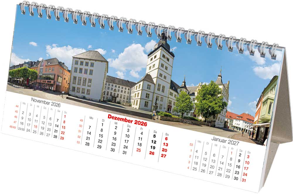 Mit 52 Seiten für Termineinträge. Der Planer liegt nicht nur flach auf dem Schreibtisch, um Termineinträge vorzunehmen: Der Planer ist ein Aufstellkalender mit dem aufgestellten Panoramafoto, das wöchentlich wechselt.