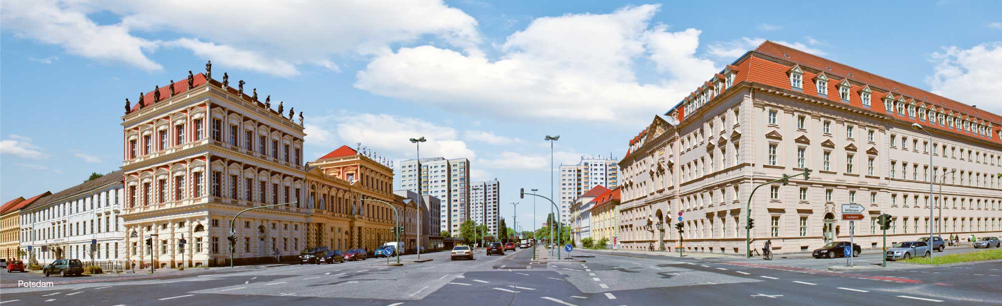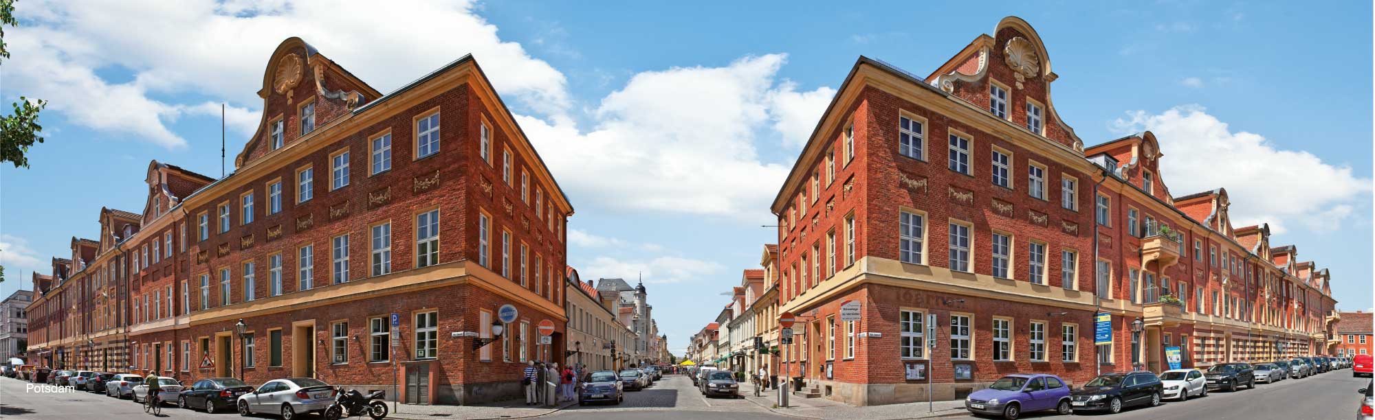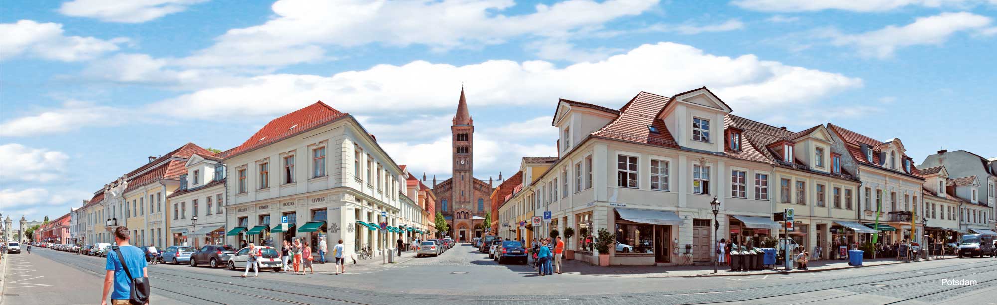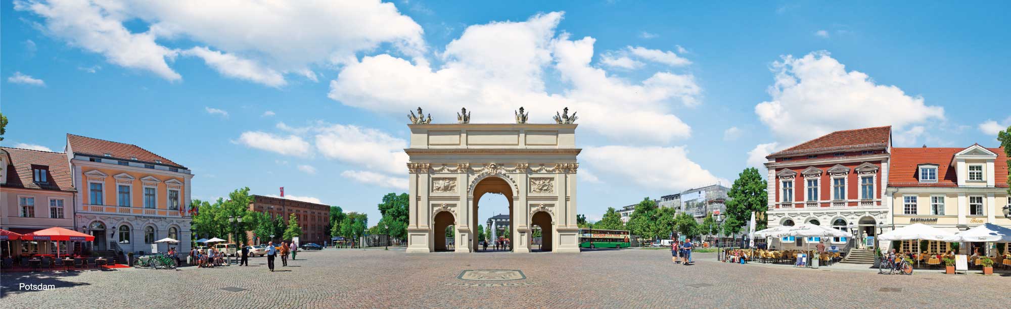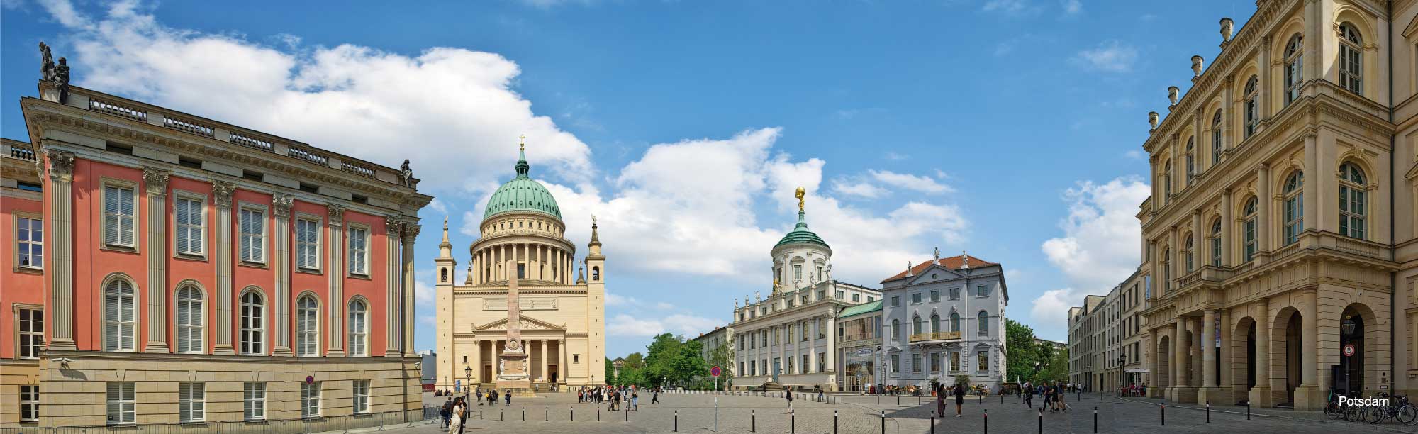 Eines der Panoramen ist die Nikolaikirche am Alten Markt mit dem umgebenden Häuserensemble. Weitere Panoramen von Potsdam, die einen Rundblick von mehr als 180 Grad bieten: das Stadtschloss, Schloss Sanssouci, das Marmorpalais und viele weitere Panoramen der Altstadt.