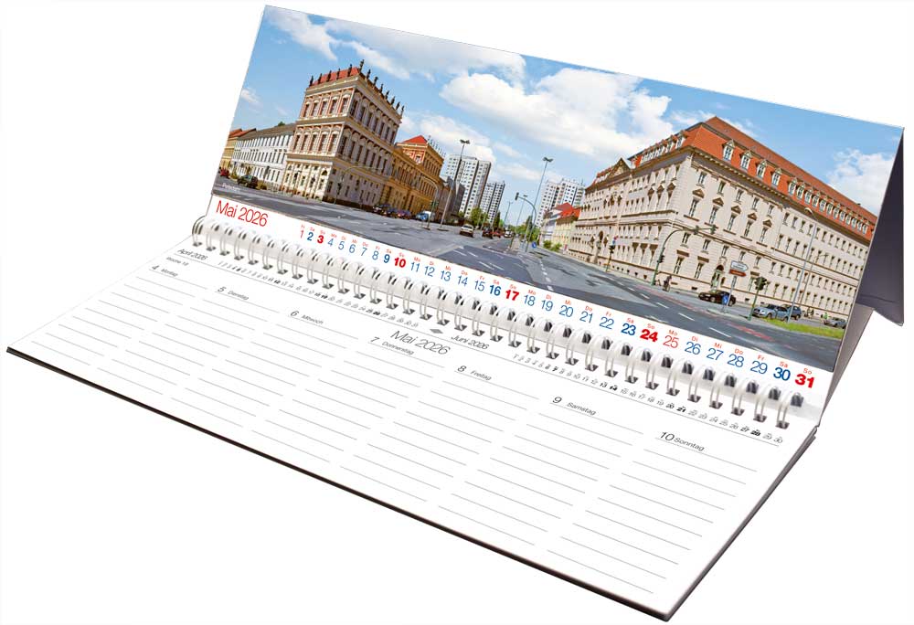 Mit 52 Seiten für Termineinträge. Der Planer liegt nicht nur flach auf dem Schreibtisch, um Termineinträge vorzunehmen: Der Planer ist ein Aufstellkalender mit dem aufgestellten Panoramafoto, das wöchentlich wechselt.