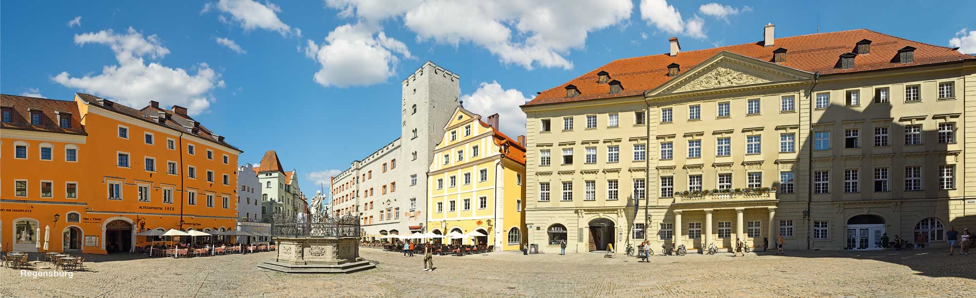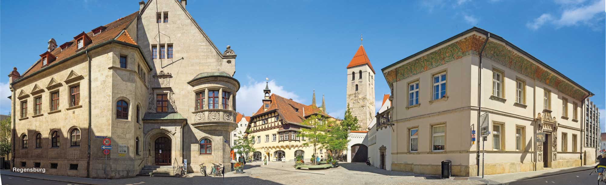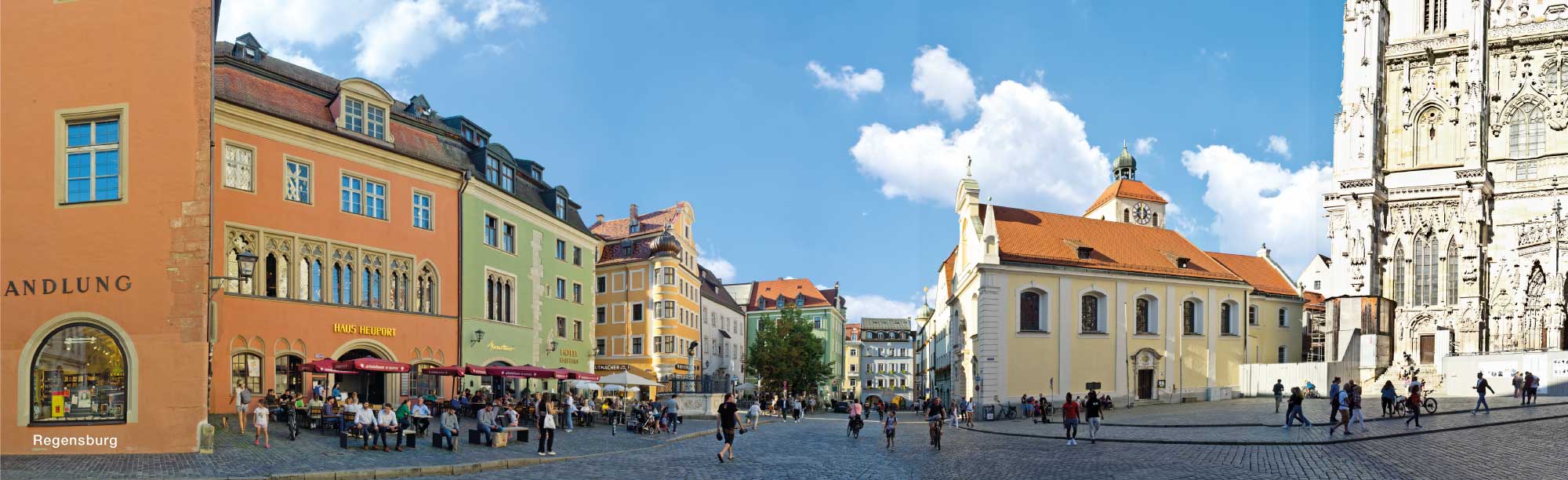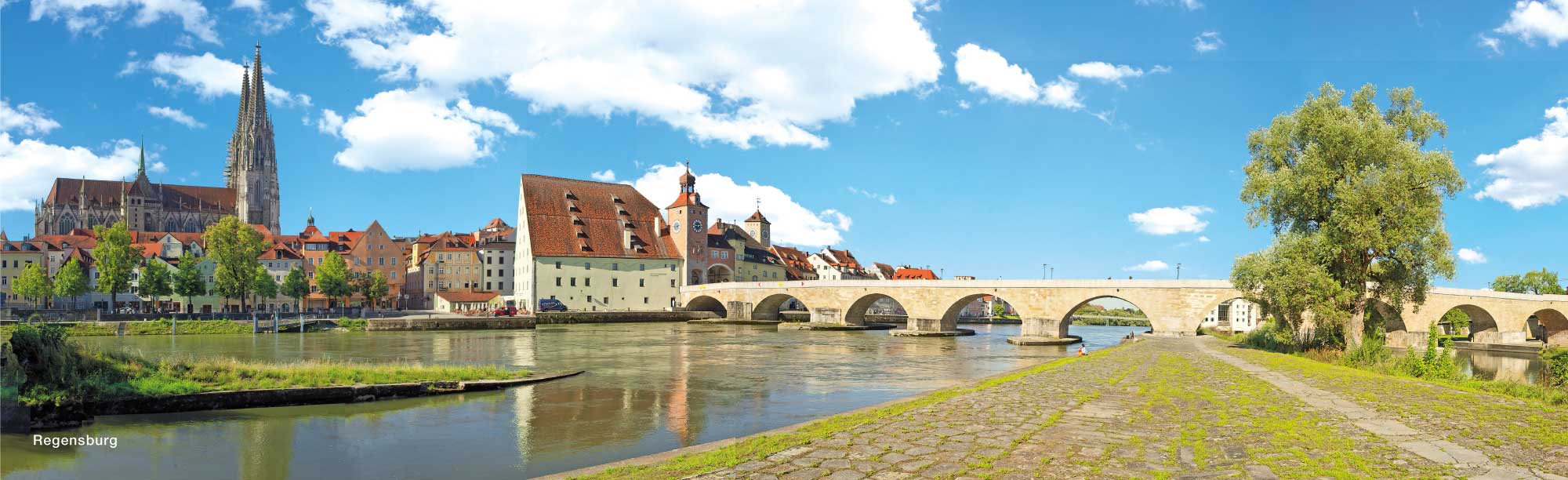 Die Steinerne Brücke und der Dom St. Peter ist eines der Panoramen von Regensburg. Weitere Panoramen mit einem Blickwinkel von mehr als 180 Grad: das Alte Rathaus mit Reichssaal, der Haidplatz, das Schloss Emmermann und viele andere.