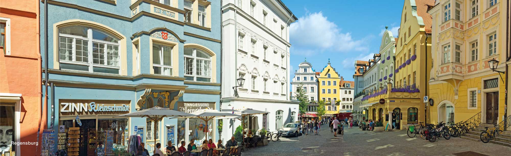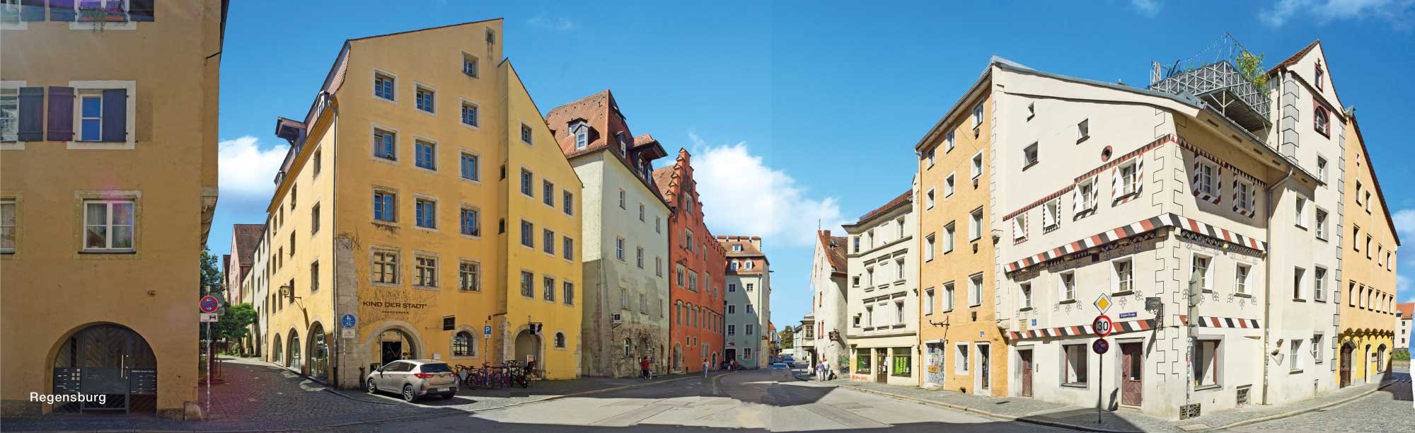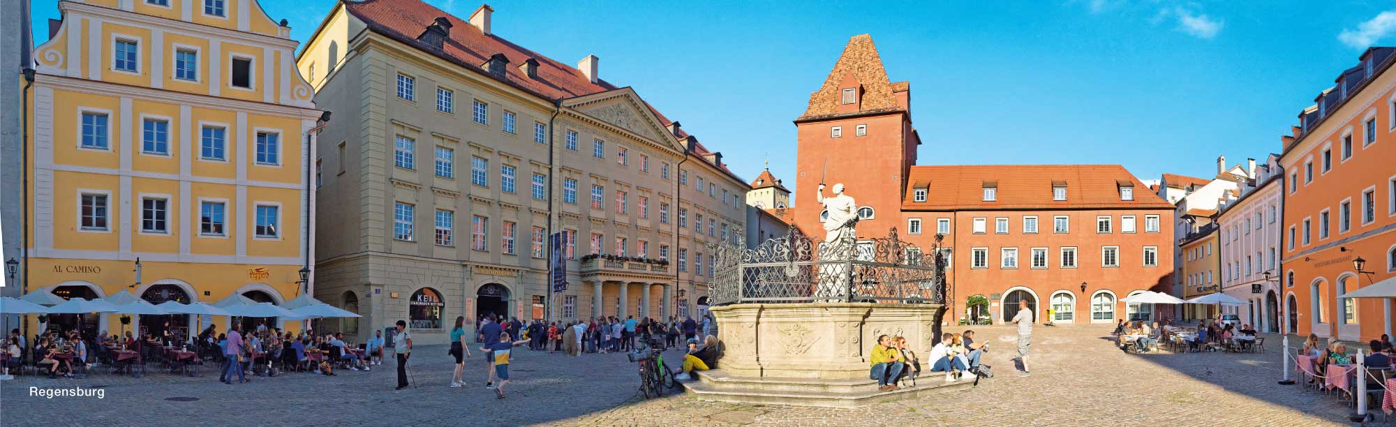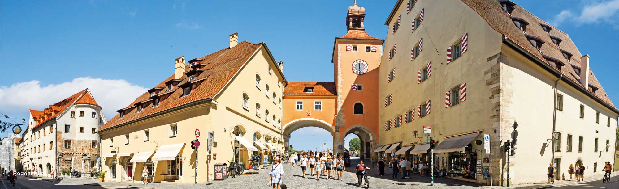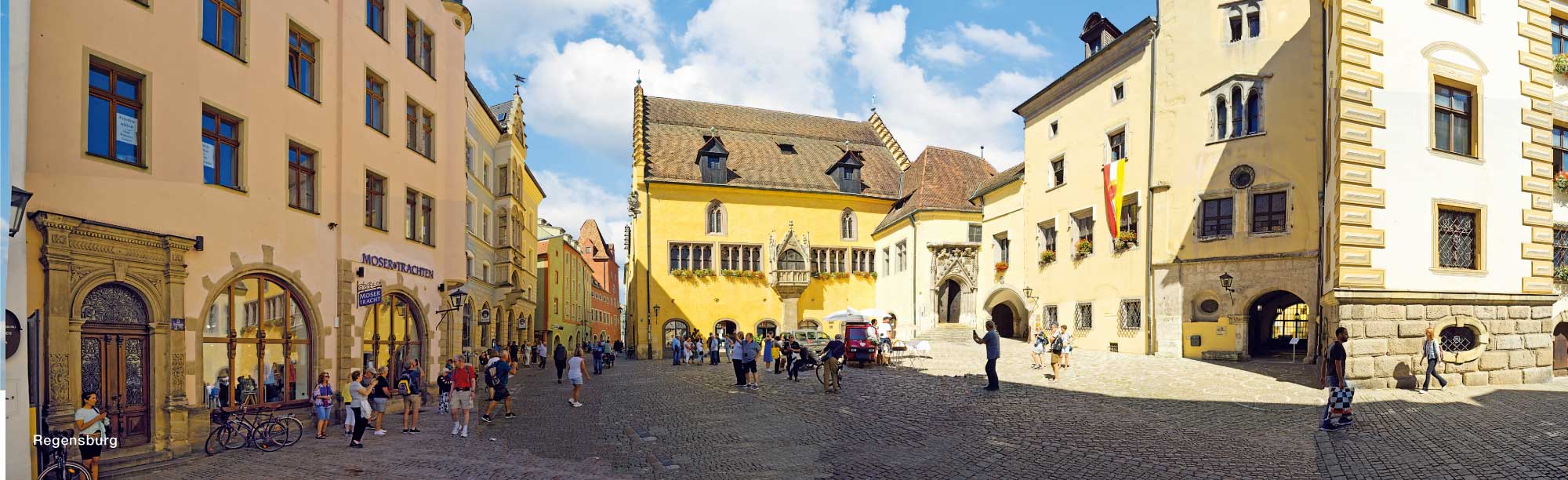 Die Steinerne Brücke und der Dom St. Peter ist eines der Panoramen von Regensburg. Weitere Panoramen mit einem Blickwinkel von mehr als 180 Grad: das Alte Rathaus mit Reichssaal, der Haidplatz, das Schloss Emmermann und viele andere.