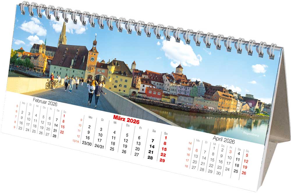 Mit 52 Seiten für Termineinträge. Der Planer liegt nicht nur flach auf dem Schreibtisch, um Termineinträge vorzunehmen: Der Planer ist ein Aufstellkalender mit dem aufgestellten Panoramafoto, das wöchentlich wechselt.