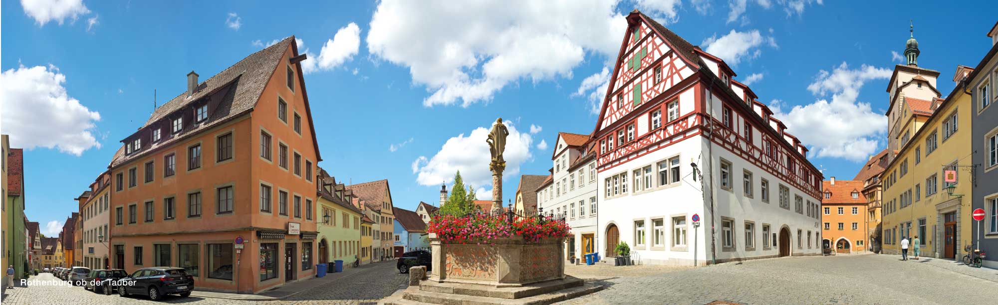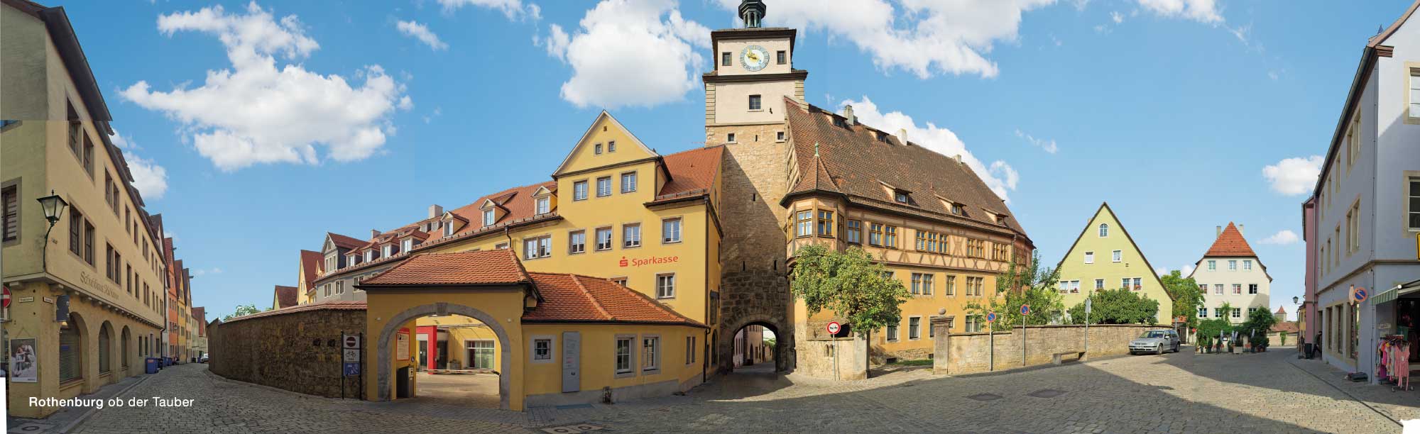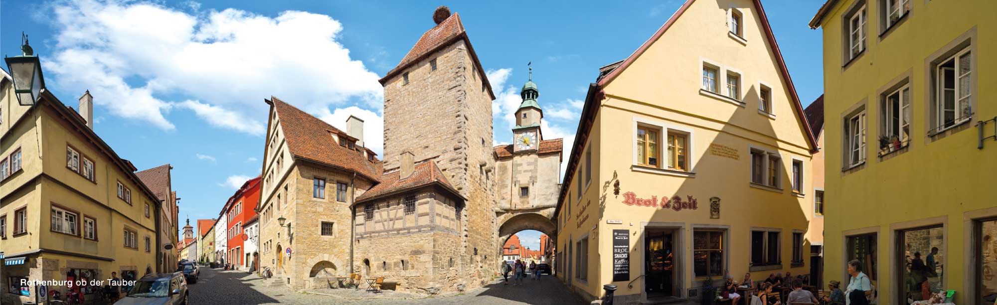 Das Plönlein mit dem Sieberstor und dem Kobolzeller Tor ist eines der Panoramen von Rothenburg. Weitere Panoramen mit einem Rundblick von mehr als 180 Grad: der Röderbogen und Markusturm mit umgebenden Gebäuden, das prächtige Rathaus mit Brunnen und umliegenden Gebäudeensembles, die Gerlachschmiede und vieles mehr.