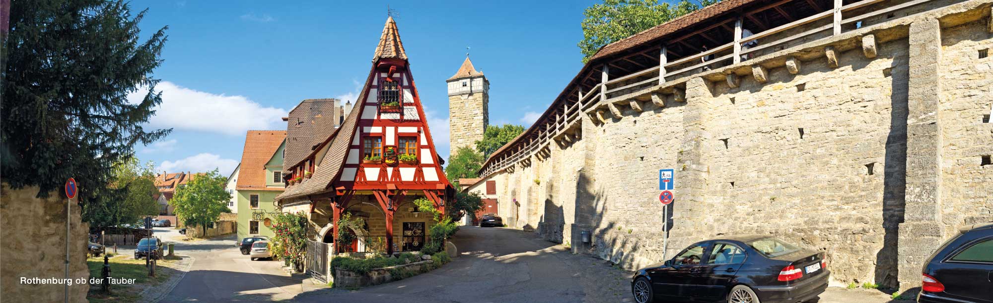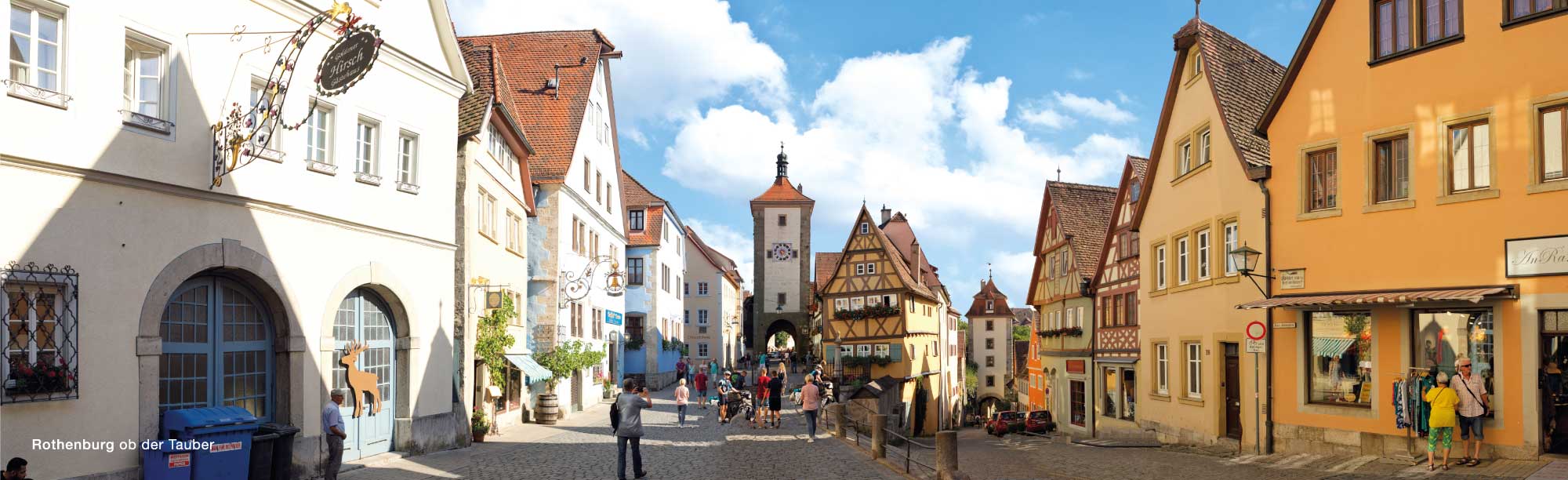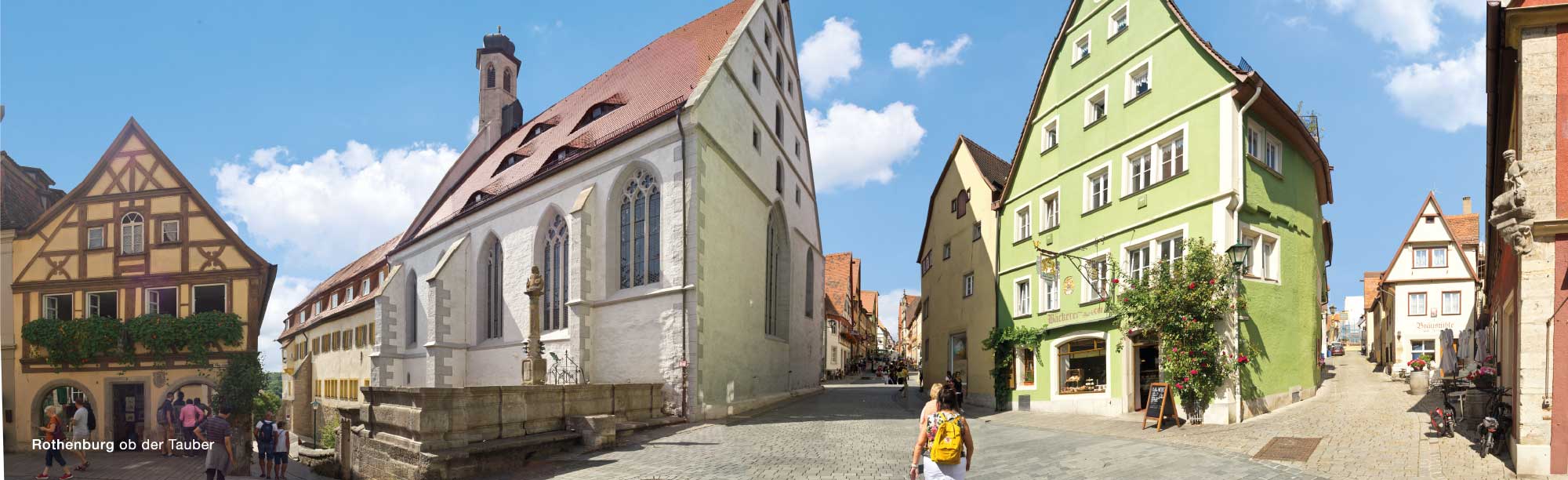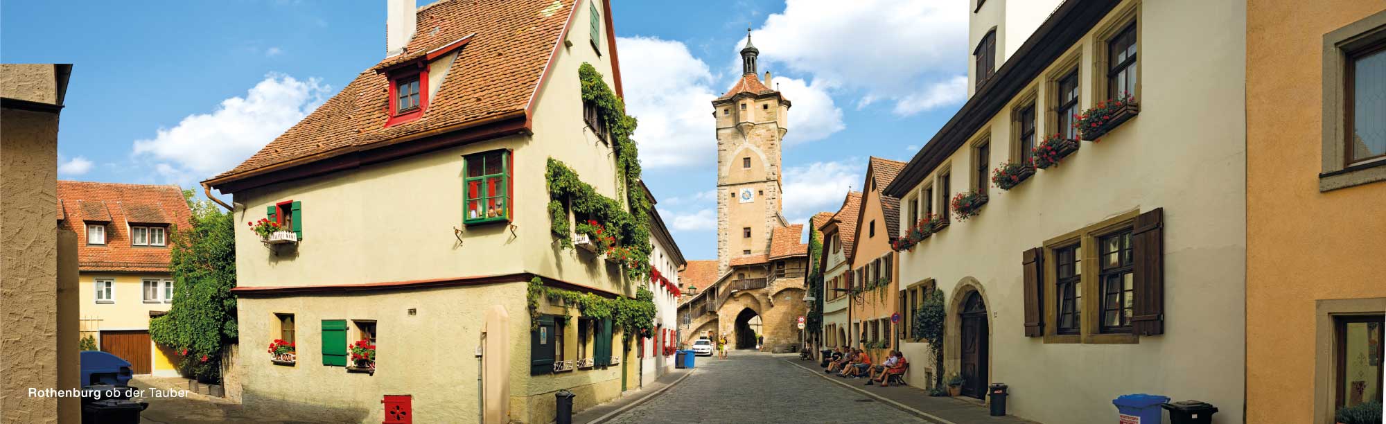 Das Plönlein mit dem Sieberstor und dem Kobolzeller Tor ist eines der Panoramen von Rothenburg. Weitere Panoramen mit einem Rundblick von mehr als 180 Grad: der Röderbogen und Markusturm mit umgebenden Gebäuden, das prächtige Rathaus mit Brunnen und umliegenden Gebäudeensembles, die Gerlachschmiede und vieles mehr.