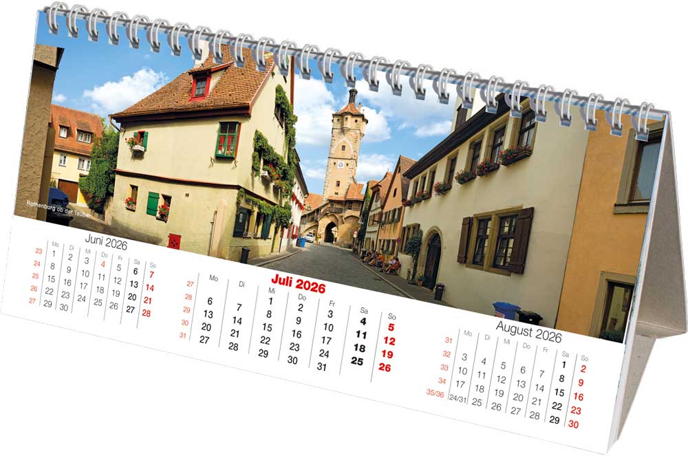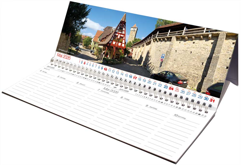 Mit 52 Seiten für Termineinträge. Der Planer liegt nicht nur flach auf dem Schreibtisch, um Termineinträge vorzunehmen: Der Planer ist ein Aufstellkalender mit dem aufgestellten Panoramafoto, das wöchentlich wechselt.