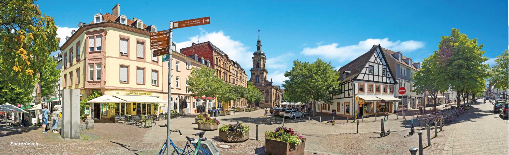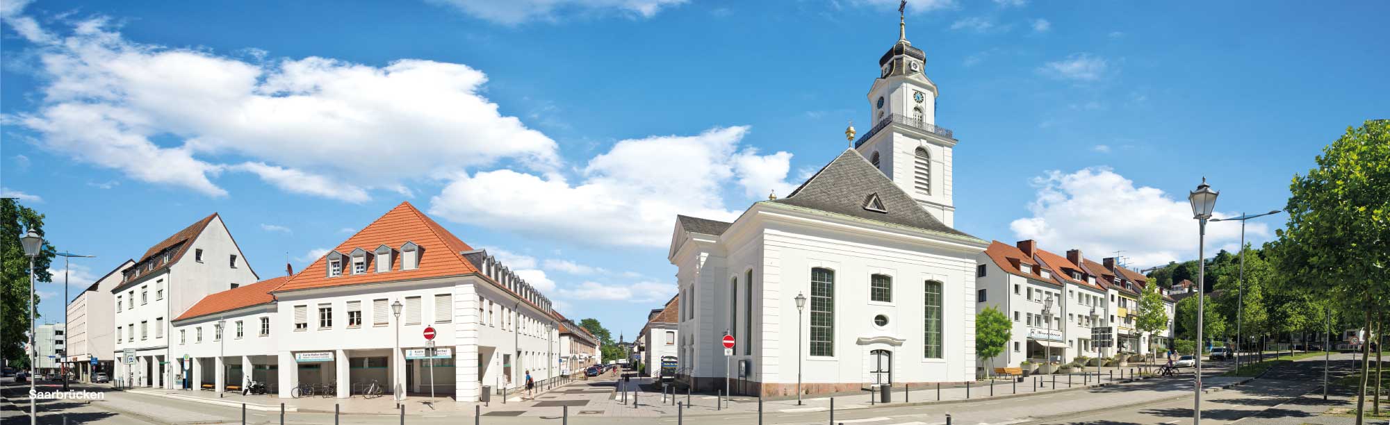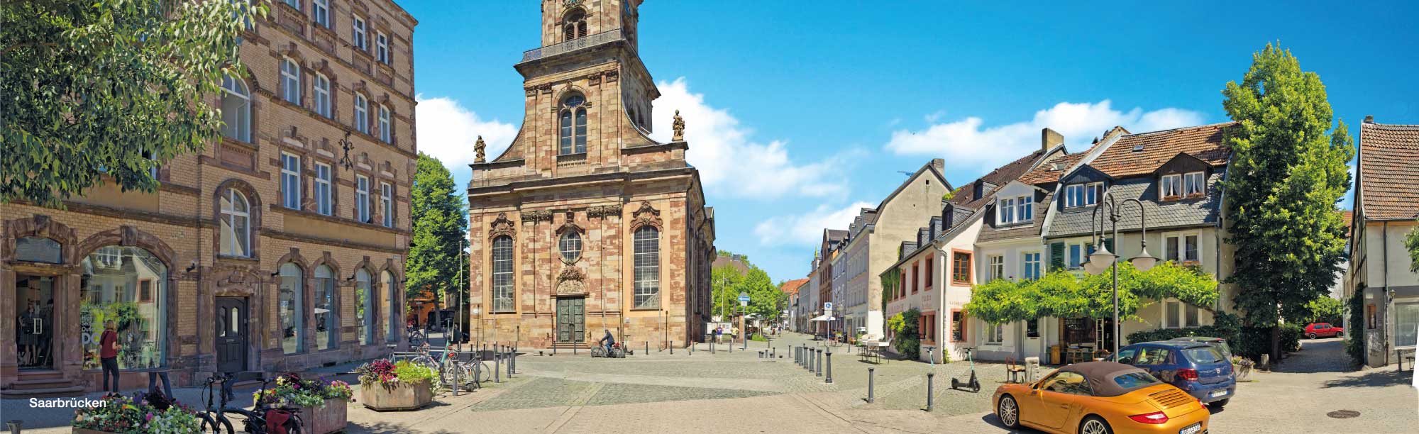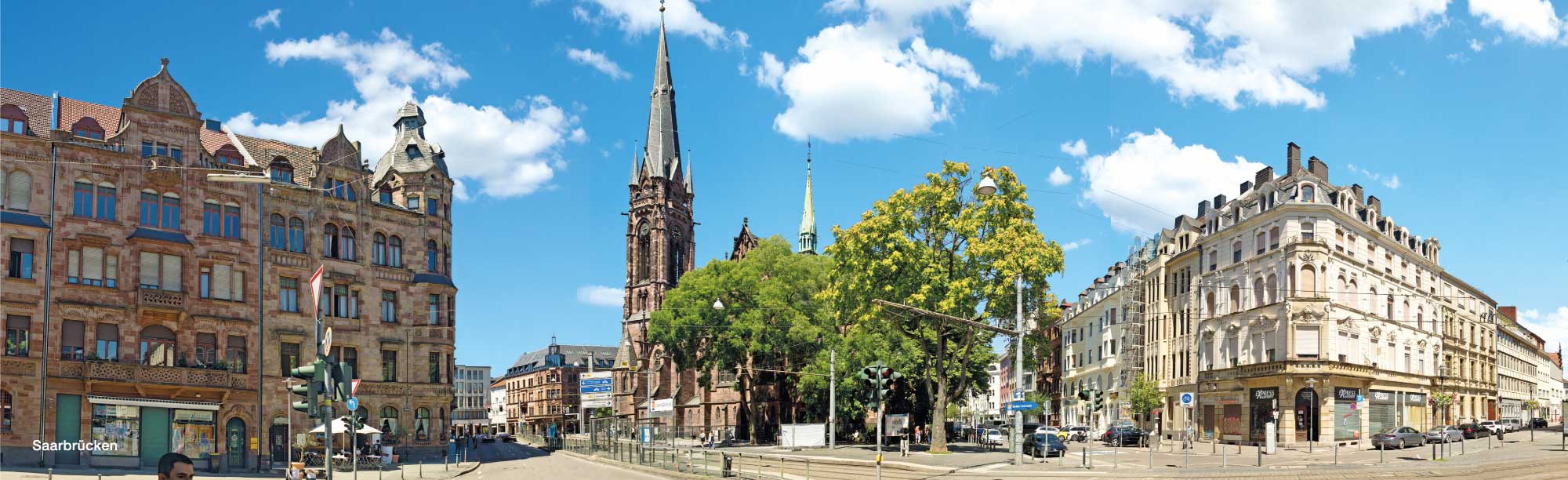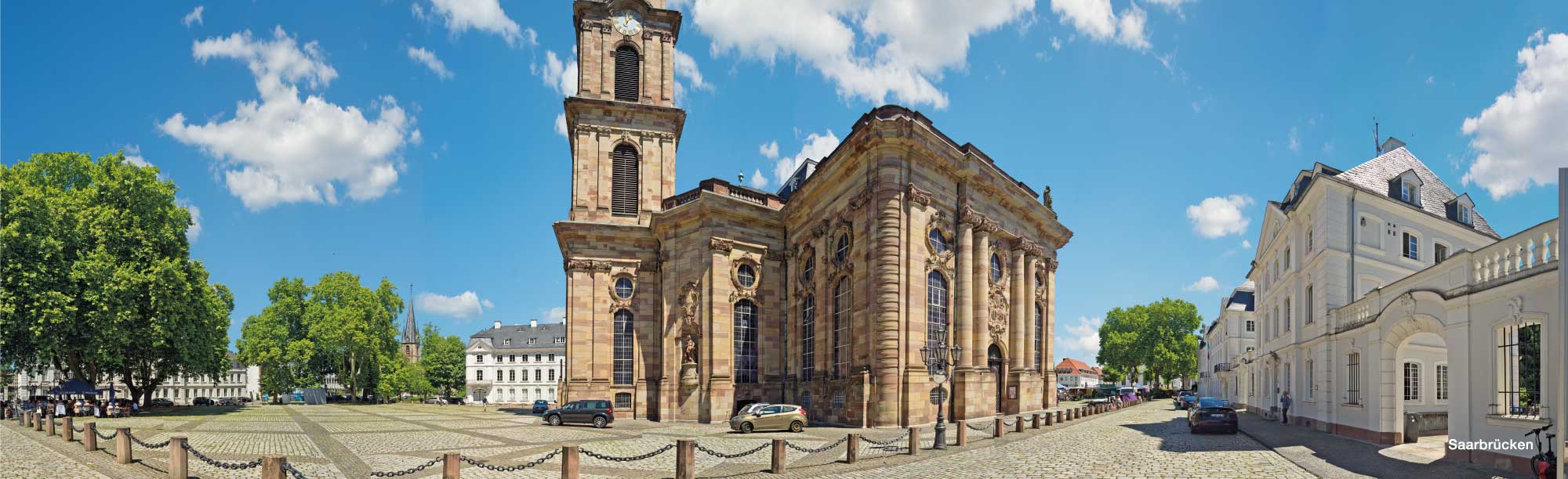 Die Ludwigskirche in Alt-Saarbrücken ist eines der Panoramen mit einem Blickwinkel von mehr als 180 Grad. Weitere Panoramen von Saarbrücken: der Rathausplatz, das prächtige Schloss, die Basilika St. Johann, die Fröschengasse und viele andere.