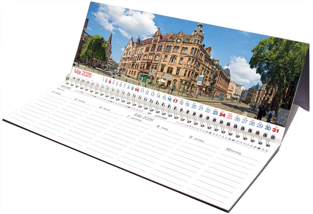 Mit 52 Seiten für Termineinträge. Der Planer liegt nicht nur flach auf dem Schreibtisch, um Termineinträge vorzunehmen: Der Planer ist ein Aufstellkalender mit dem aufgestellten Panoramafoto, das wöchentlich wechselt.
