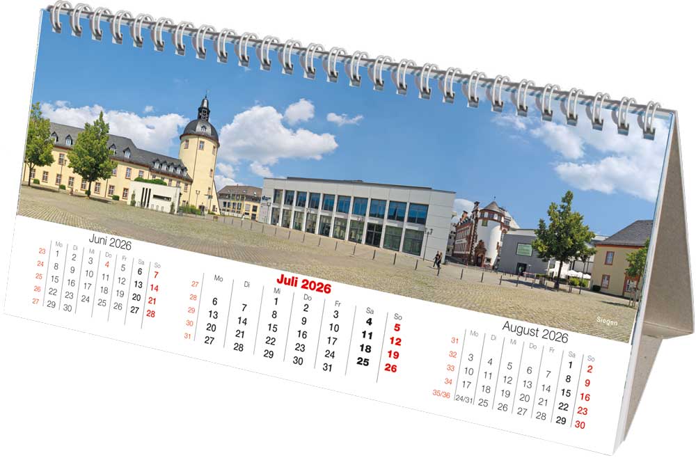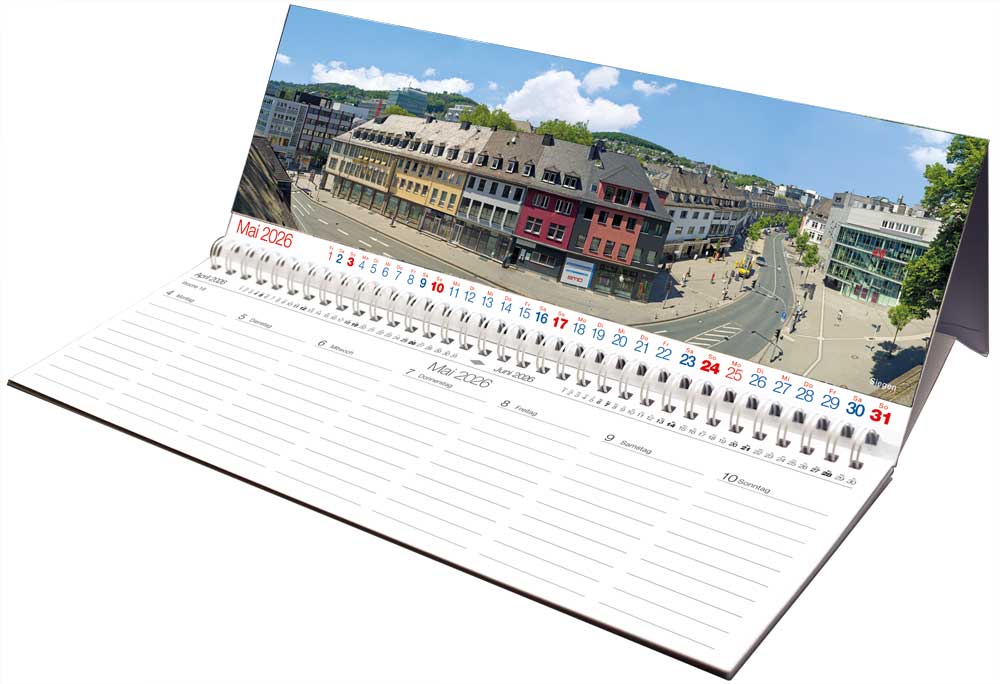 Mit 52 Seiten für Termineinträge. Der Planer liegt nicht nur flach auf dem Schreibtisch, um Termineinträge vorzunehmen: Der Planer ist ein Aufstellkalender mit dem aufgestellten Panoramafoto, das wöchentlich wechselt.
