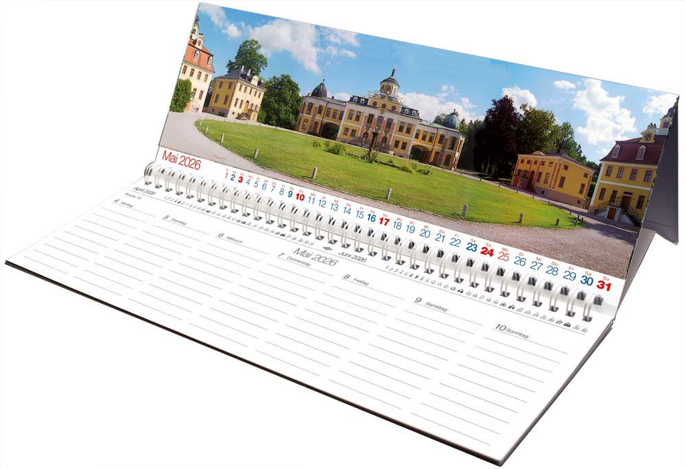 Mit 52 Seiten für Termineinträge. Der Planer liegt nicht nur flach auf dem Schreibtisch, um Termineinträge vorzunehmen: Der Planer ist ein Aufstellkalender mit dem aufgestellten Panoramafoto, das wöchentlich wechselt.