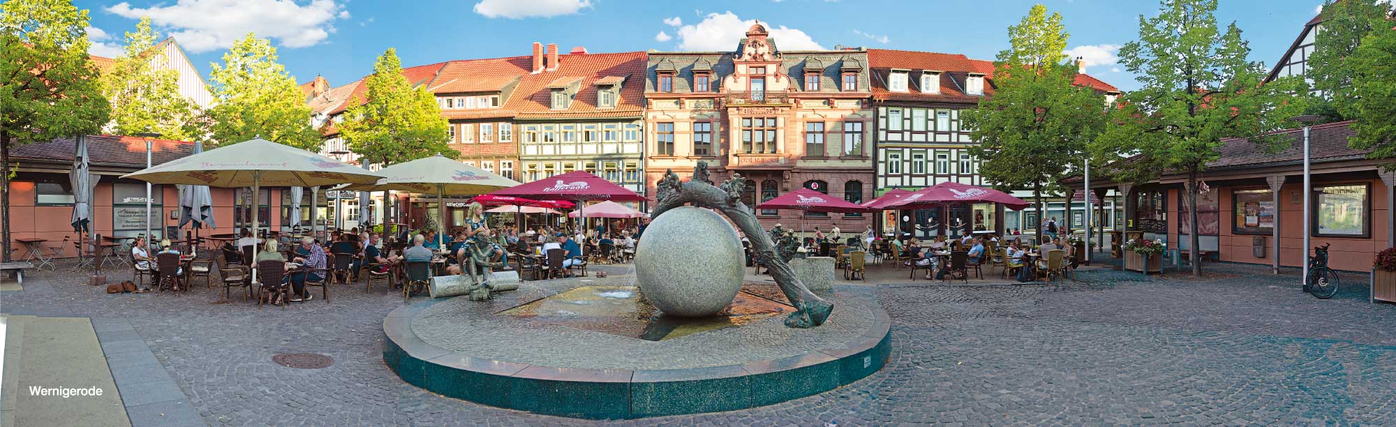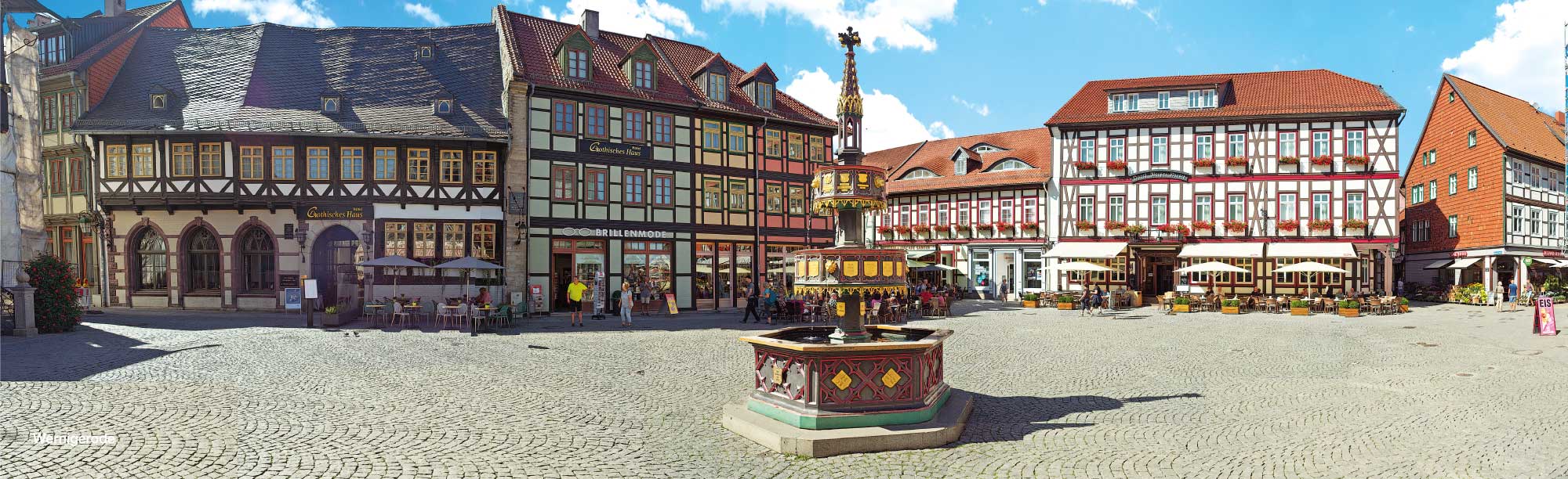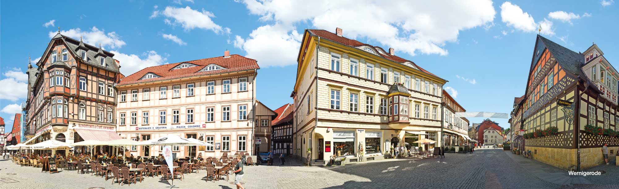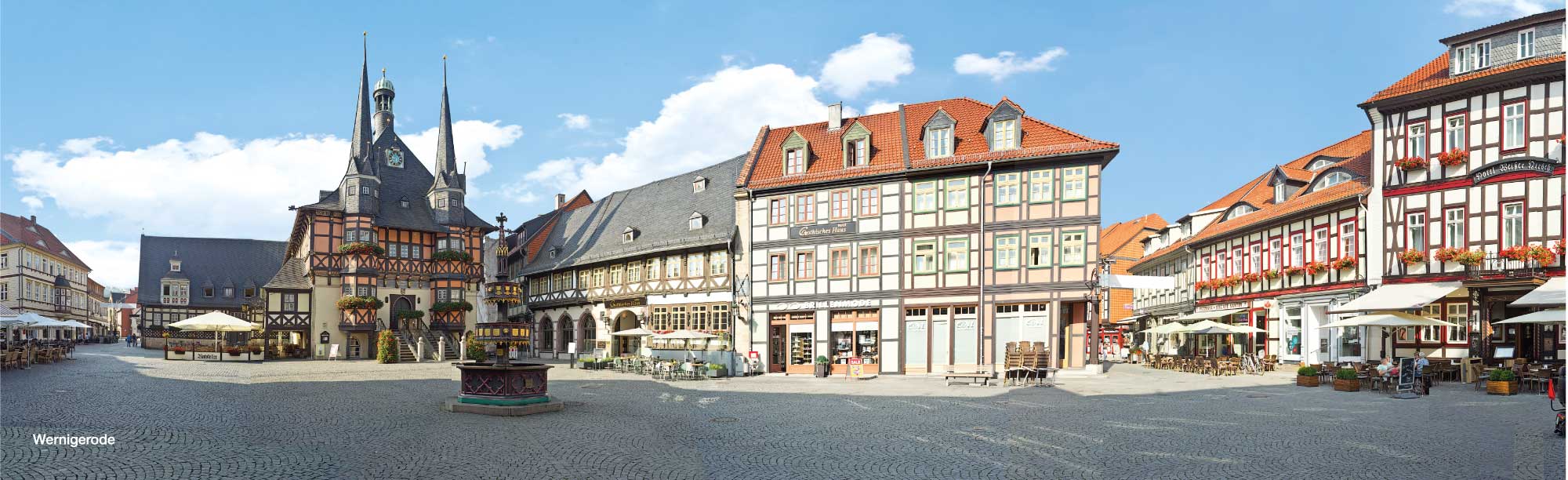 Der Marktplatz von Wernigerode mit Rathaus und angrenzenden Gebäuden ist eines der Panoramen, mit einem Rundblick von mehr als 180 Grad. Weitere Wernigerode Panoramen: Fachwerkhäuser am Kleinsten Haus mit Blick aus Schloss Wernigerode, Marktstraße hinter dem Rathaus und vieles mehr.