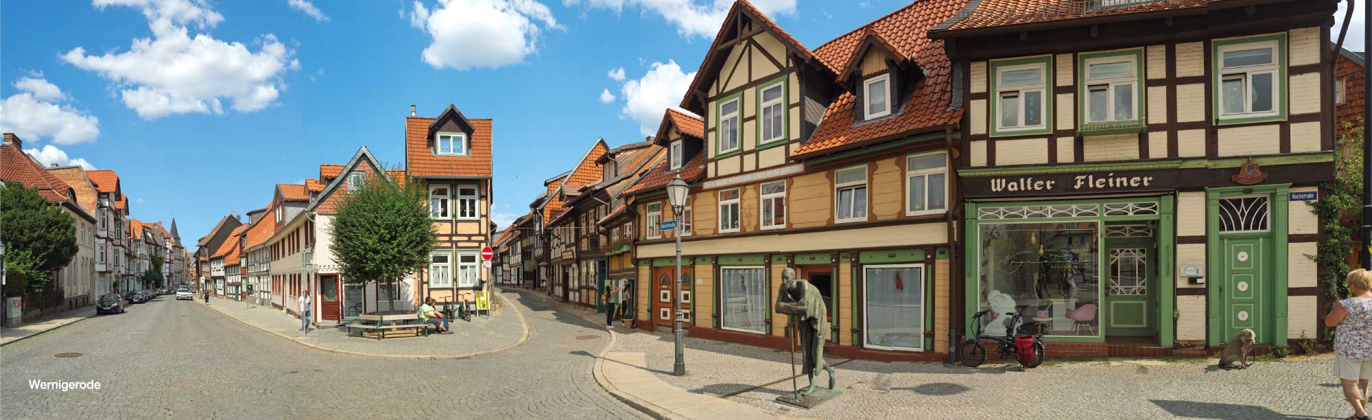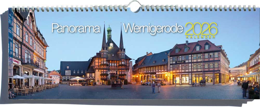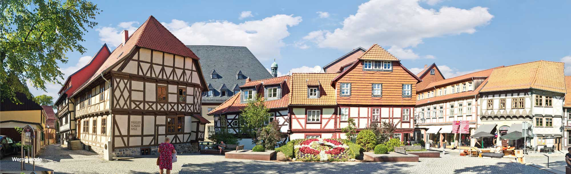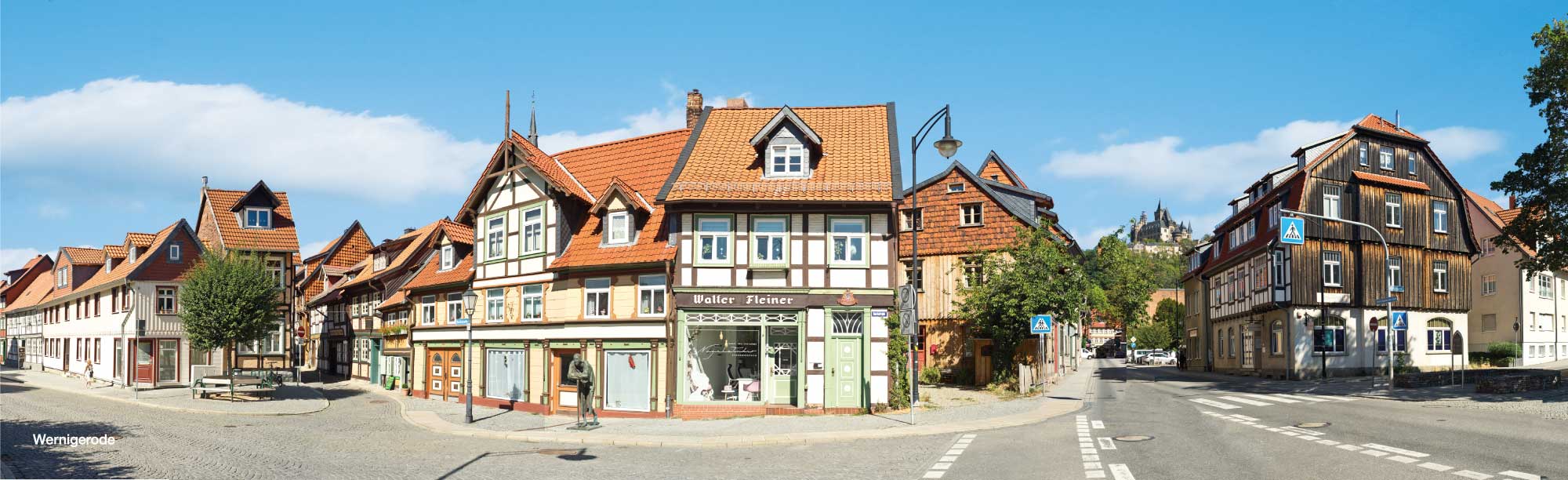 Der Marktplatz von Wernigerode mit Rathaus und angrenzenden Gebäuden ist eines der Panoramen, mit einem Rundblick von mehr als 180 Grad. Weitere Wernigerode Panoramen: Fachwerkhäuser am Kleinsten Haus mit Blick aus Schloss Wernigerode, Marktstraße hinter dem Rathaus und vieles mehr.