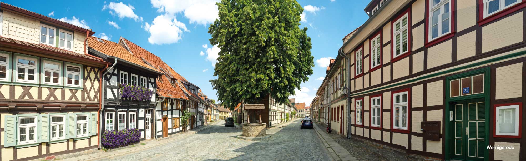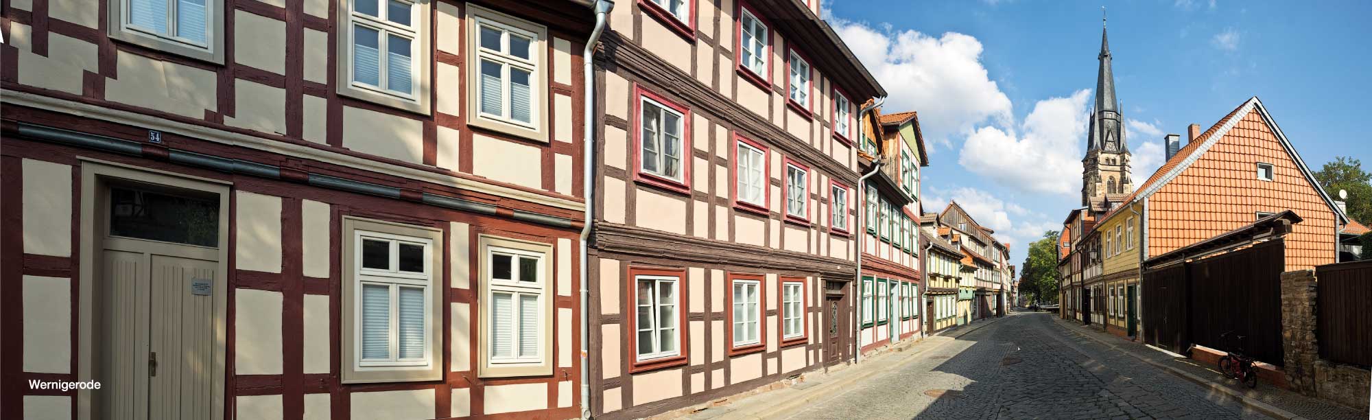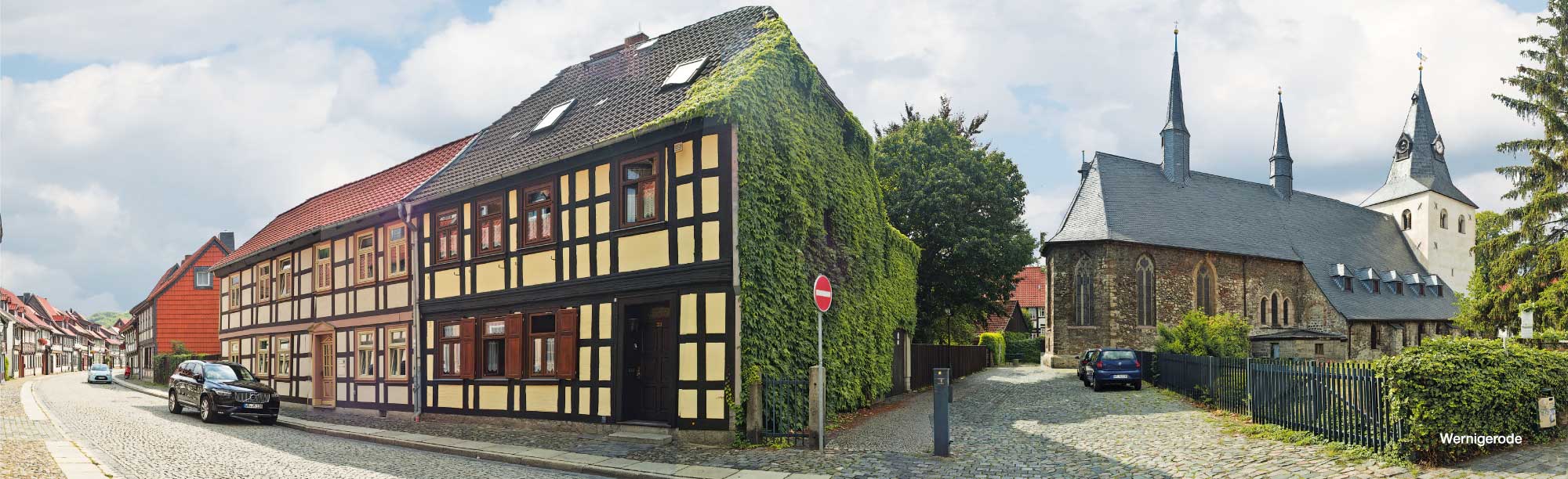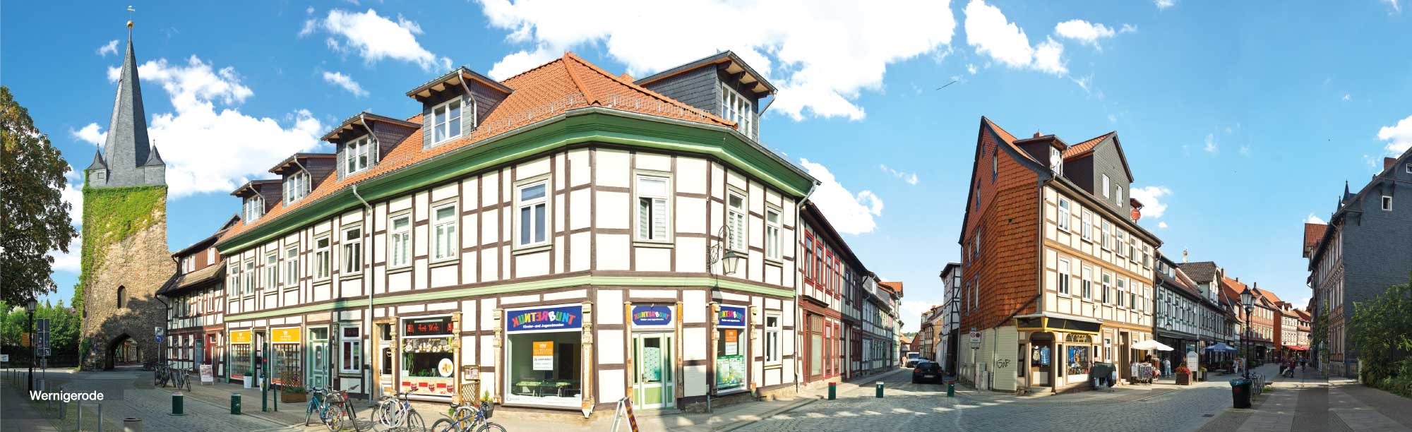 Der Marktplatz von Wernigerode mit Rathaus und angrenzenden Gebäuden ist eines der Panoramen, mit einem Rundblick von mehr als 180 Grad. Weitere Wernigerode Panoramen: Fachwerkhäuser am Kleinsten Haus mit Blick aus Schloss Wernigerode, Marktstraße hinter dem Rathaus und vieles mehr.