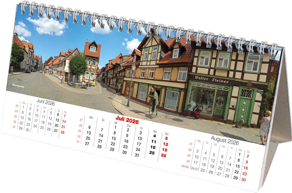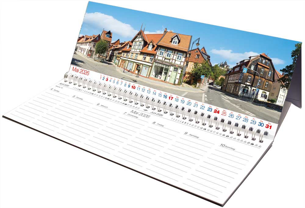 Mit 52 Seiten für Termineinträge. Der Planer liegt nicht nur flach auf dem Schreibtisch, um Termineinträge vorzunehmen: Der Planer ist ein Aufstellkalender mit dem aufgestellten Panoramafoto, das wöchentlich wechselt.