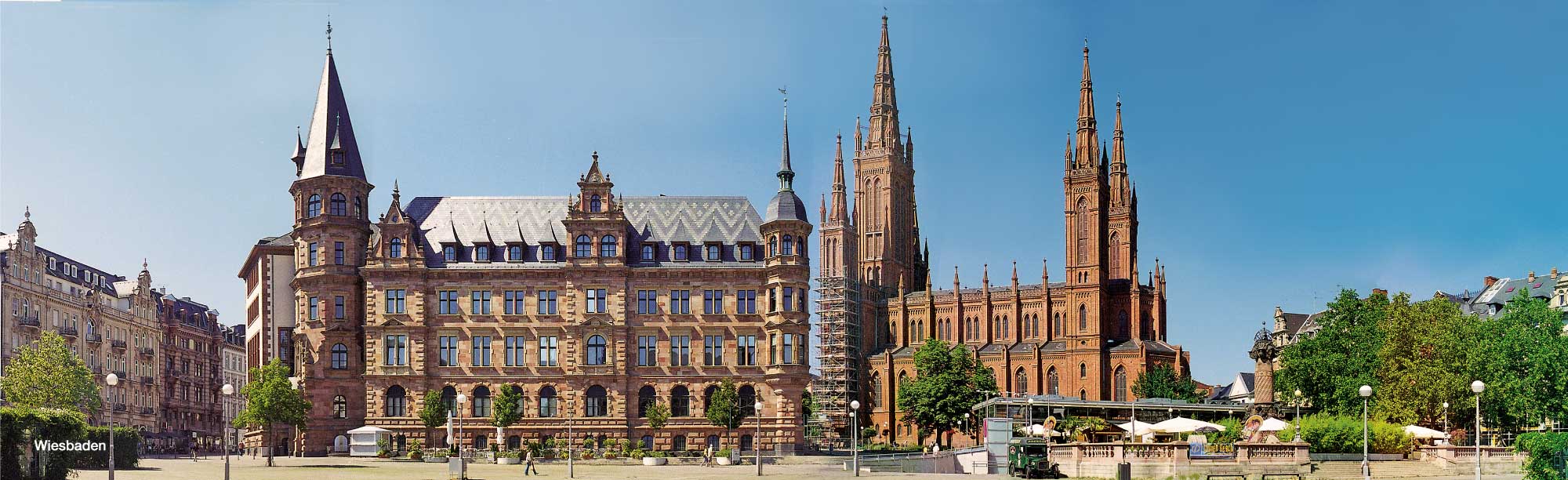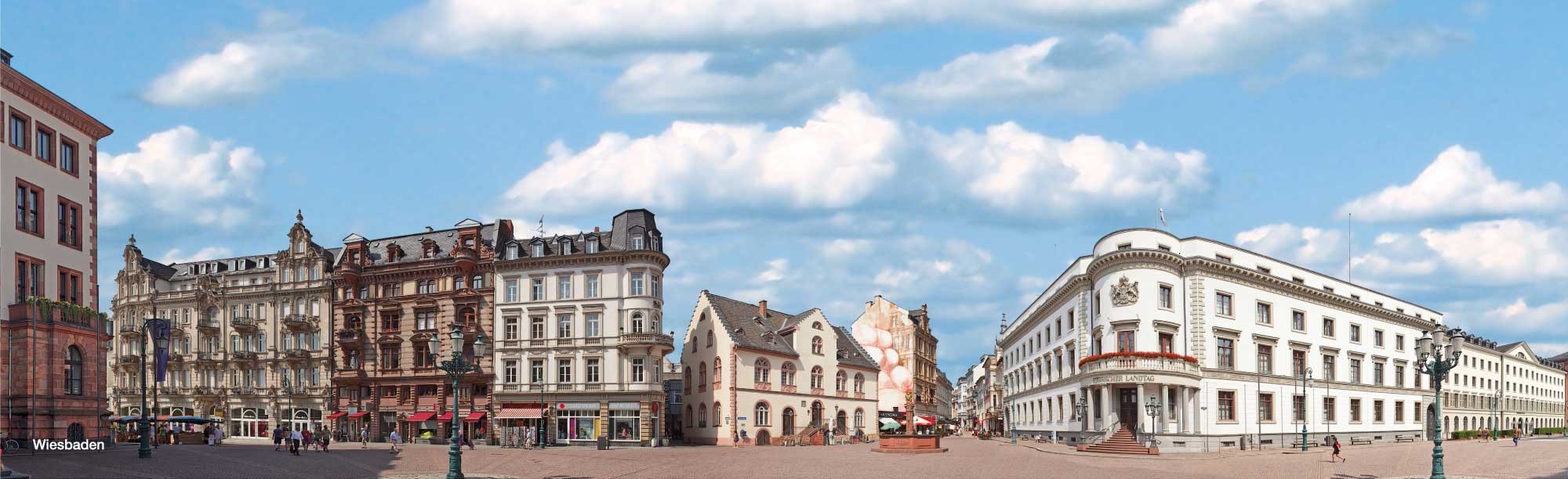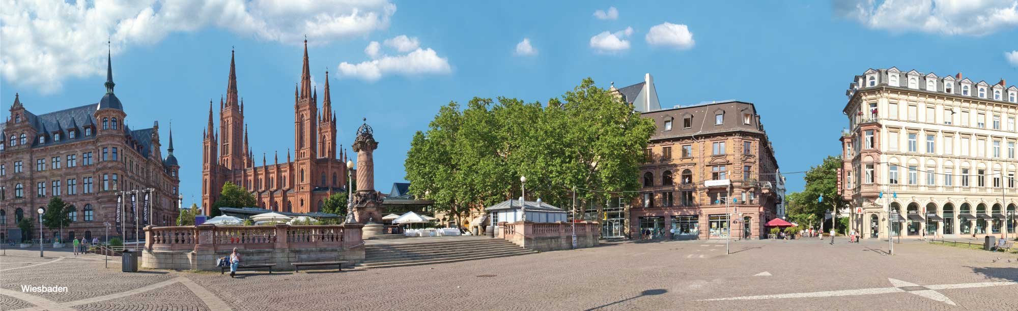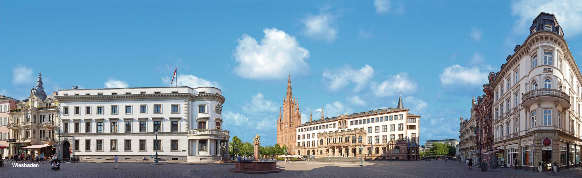 Die Marktkirche in Wiesbaden mit umgebenden Gebäuden ist eines der Panoramen, mit einem Rundblick von mehr als 180 Grad. Weitere Panoramen: das Stadtschloss am Schlossplatz, die Ringstraße, das Kurhaus, der Luisenplatz und vieles mehr.